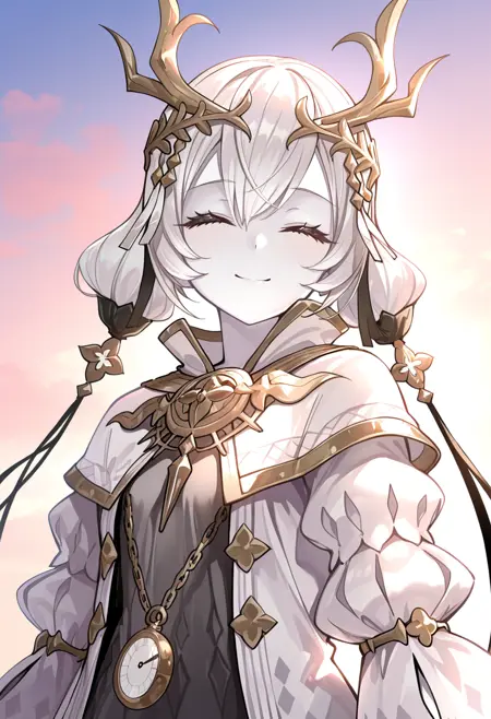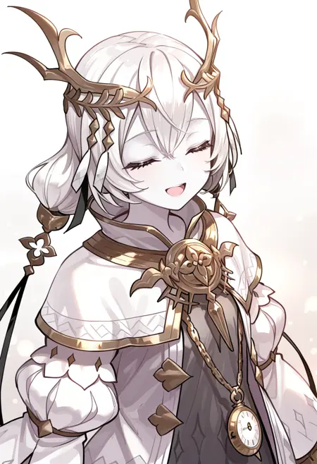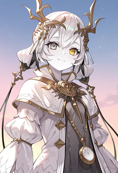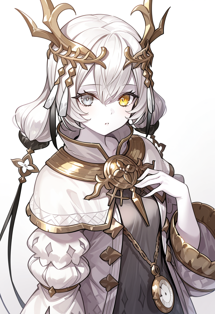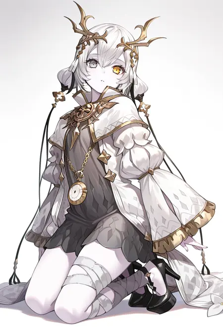 트리거 단어 - kara ideasu(ryza), 흰색 머리, 단발, 머리 장식, 창백한 피부, 이색 홍채, 노란 눈, 회색 눈, 회색 드레스, 흰 코트, 펜던트 시계, 붕대 감은 다리, 하이힐