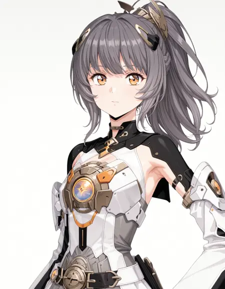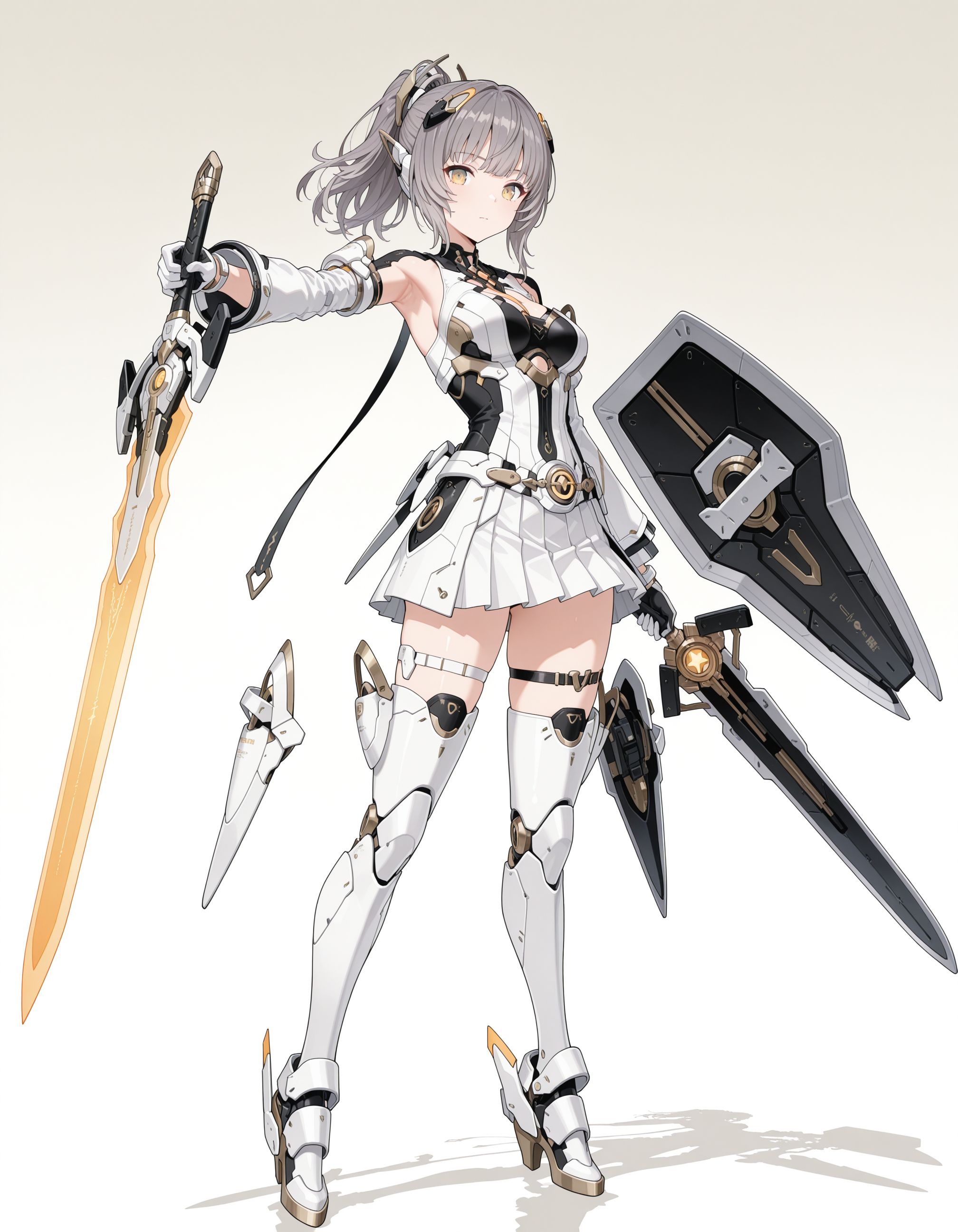 mai_pgr_nanami_mxzj,1girl,breasts,yellow_eyes,grey_hair,ponytail,skirt,gloves,thighhighs,pleated_skirt,white_skirt,boots,thigh_strap,thigh_boots,headgear,science_fiction,joints,mecha_musume,robot_joints,mechanical_legs,armpit_cutout,holding_weapon,holding_sword,holding_shield