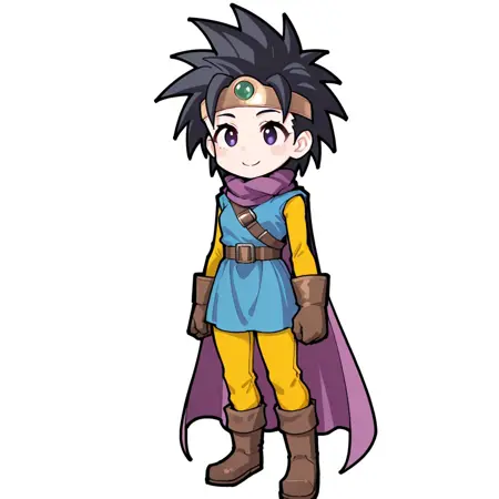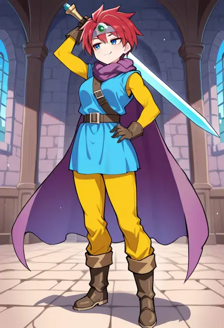 Accessories: holding sword, holding shield, “sheathed, sword on back” OR unsheathed OR unsheathing (most training data uses generic ones, but you can try your luck with Illustrious’s native understanding of “Erdrick’s Sword” and “Erdrick’s Shield” if you want)