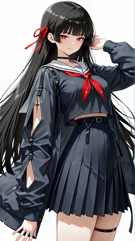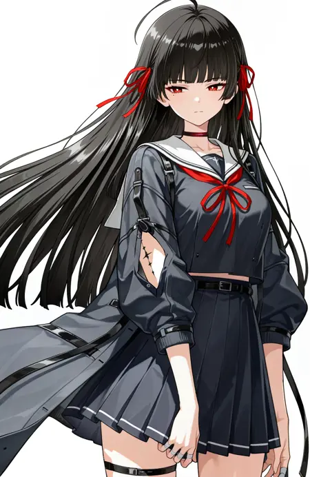 복장의 경우엔 black_serafuku,black choker,white sailor_collar,red_ribbon,arm_cutout,torn clothes,single thigh strap,black socks,grey jacket,bandaged_fingers,white bandaid 정도를 사용하면 됩니다.