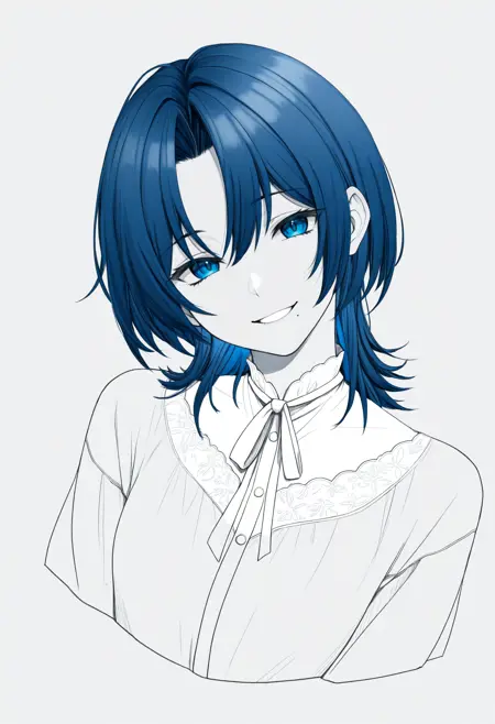 Hi0d0shiAo, blue eyes, blue hair, medium hair, parted bangs, mole under mouth