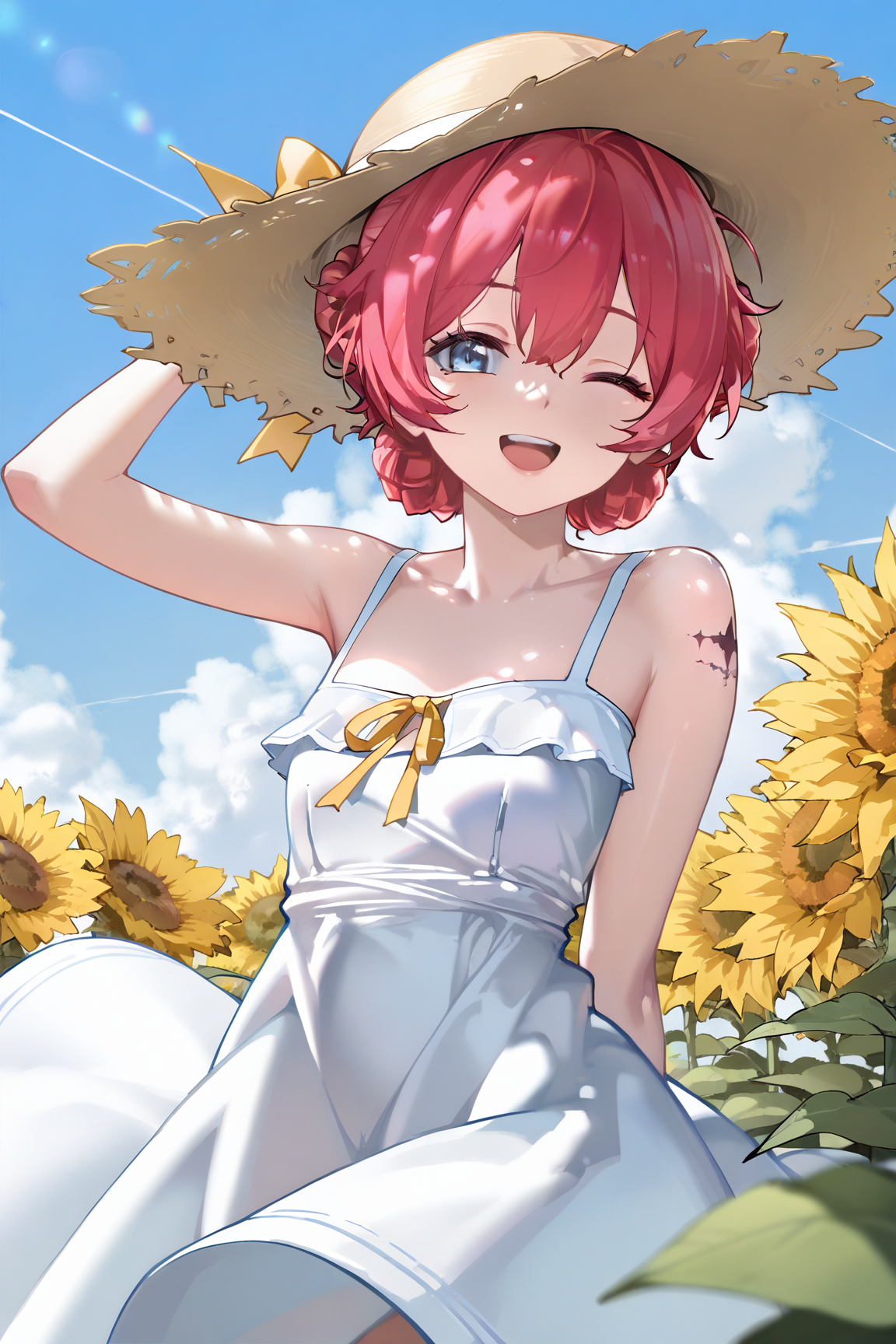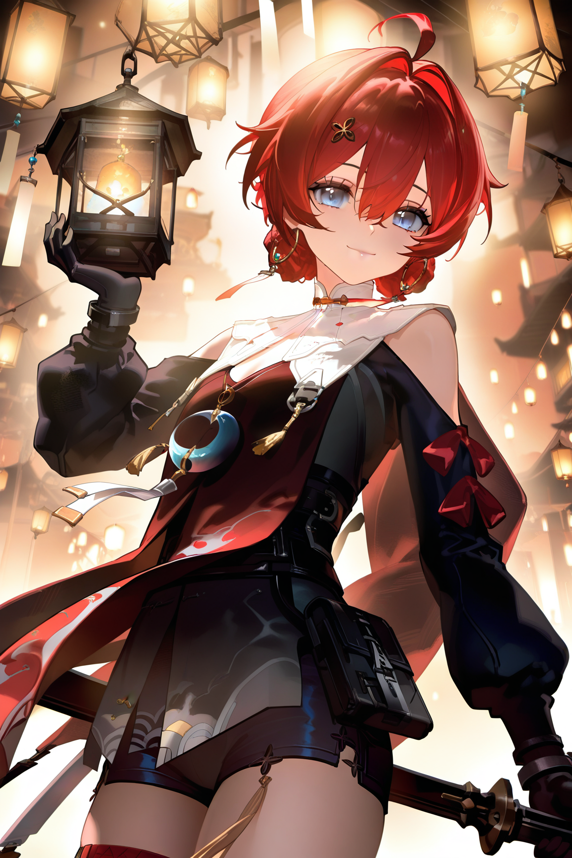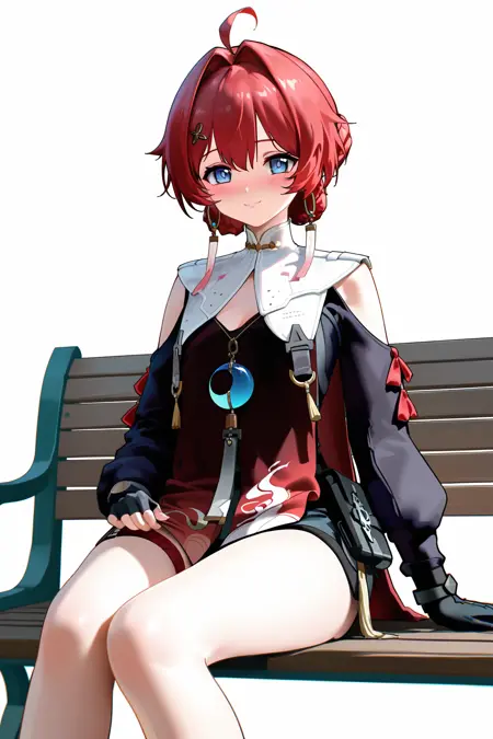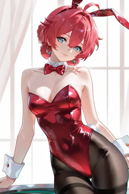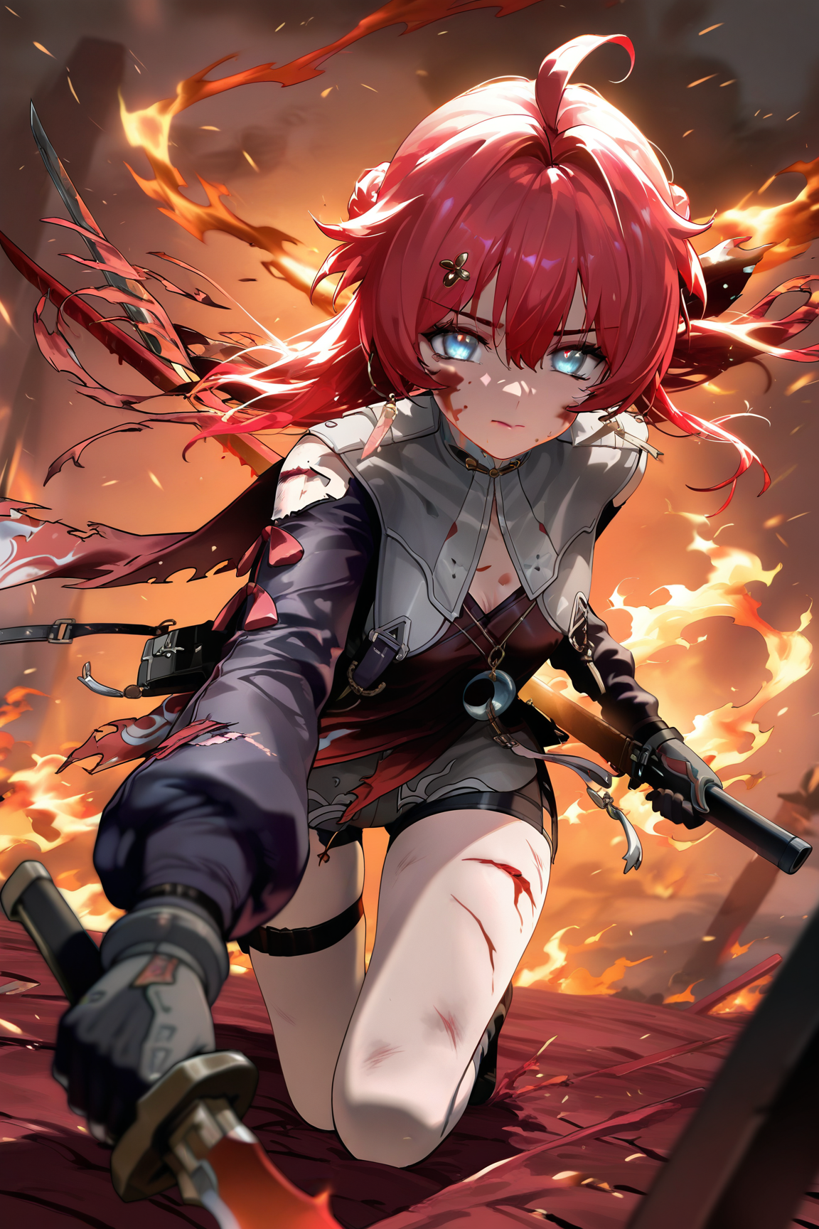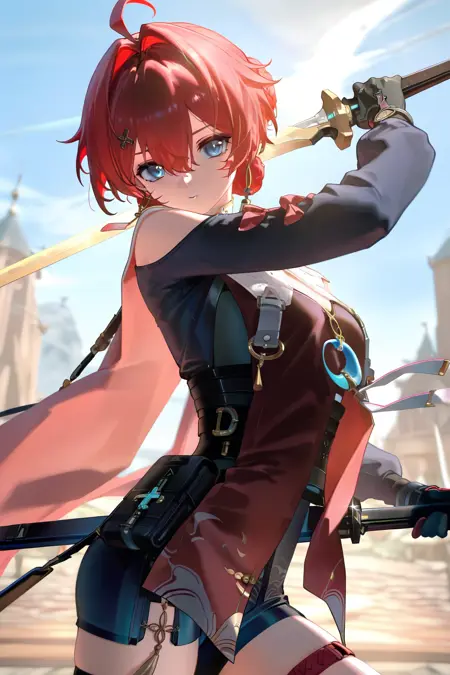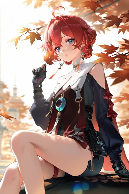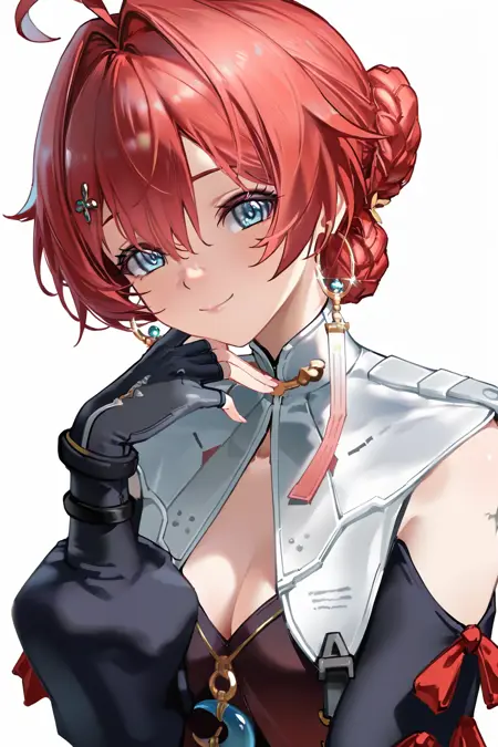 danjin \(wuthering waves\), 파란 눈, 붉은 머리카락, 1소녀, 혼자, 아호게, 머리카락이 떨어짐, 머리 장식, 땋은 머리, 보석, 분리된 소매, 짧은 머리, 귀걸이, 옷 자른 부분, 빨간 드레스, 허벅지 스트랩,