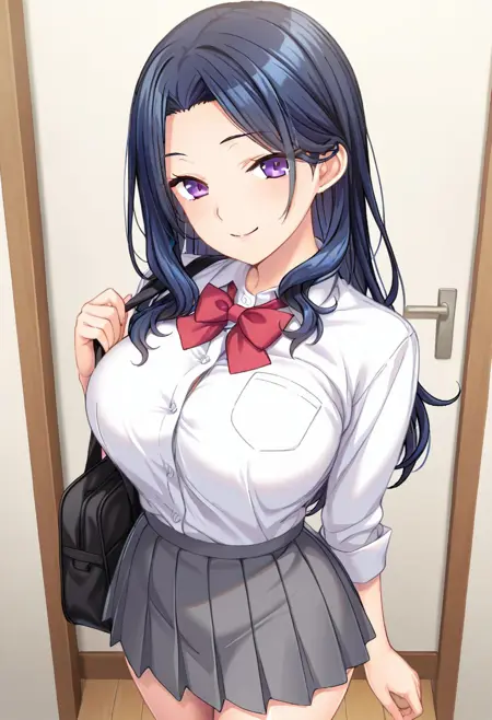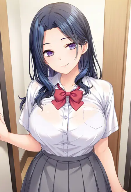 FujiMari, 검은 파란색 머리, 긴 곱슬머리, 보라색 눈