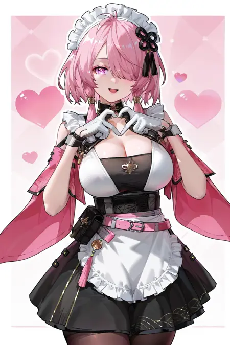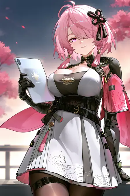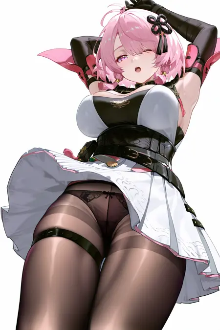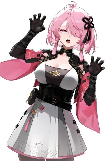 taoqi \(wuthering waves\), 1girl, solo, 분홍 눈, 분홍 머리, 한쪽 눈을 가리는 머리카락, 장갑, 검은 벨트, 검은 장갑, 드레스, 검은 팬티스타킹, 벨트, 머리 장신구, 팬티스타킹, ahoge, 테셀, 흰 드레스,