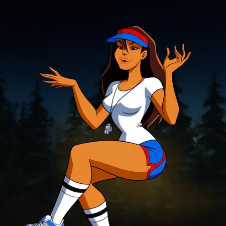 JessicaSDCS, 1girl, solo, 운동적인 몸매, 갈색 피부, 긴 머리, 갈색 머리, 앞머리, 검은 눈, 두꺼운 입술, 큰 가슴, 굵은 허벅지, 큰 엉덩이, 빨간색과 파란색 버킷 모자, 목에 휘스틀, 흰색 셔츠, 가슴 틈, 파란색 반바지, 흰색 양말, 파란색 스니커즈,