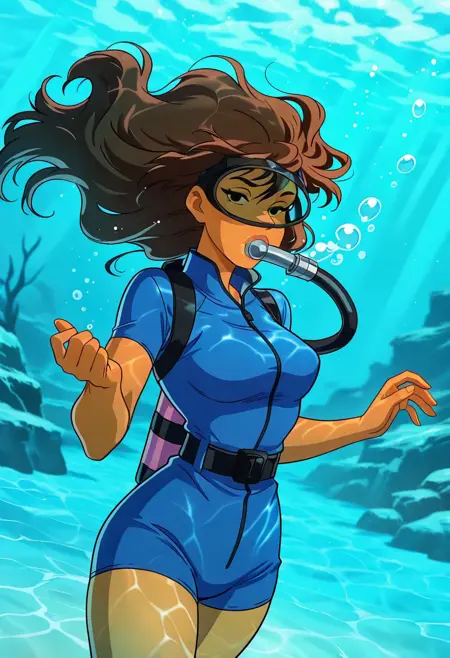 JessicaSDCS, 1girl, solo, 운동적인 몸매, 갈색 피부, 긴 머리, 갈색 머리, 앞머리, 검은 눈, 두꺼운 입술, 큰 가슴, 굵은 허벅지, 큰 엉덩이, 파란색 짧은 수영복, 다이빙 마스크, 호흡 관, 등에 산소 탱크, 다이빙 핀, 벨트,