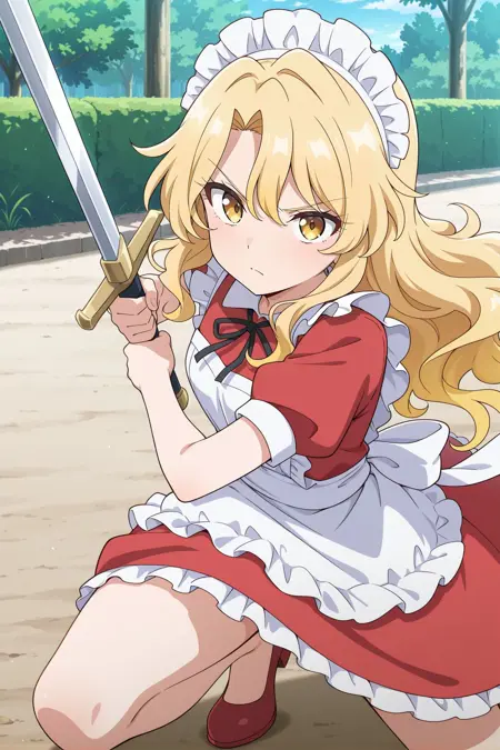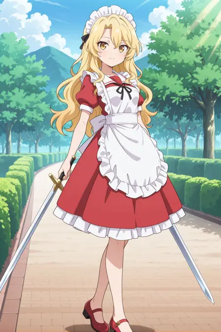 女仆头饰,颈带,黑色丝带,红色连衣裙,蓬松短袖,女仆围裙,白色围裙,红色鞋子,