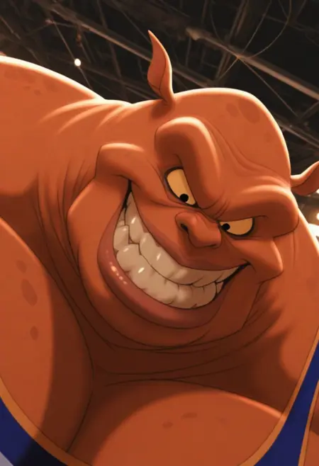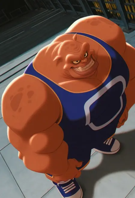 Reinforcement Prompts: "colored skin, orange skin, yellow sclera, black eyes, muscular, bara, manly, pectorals"
