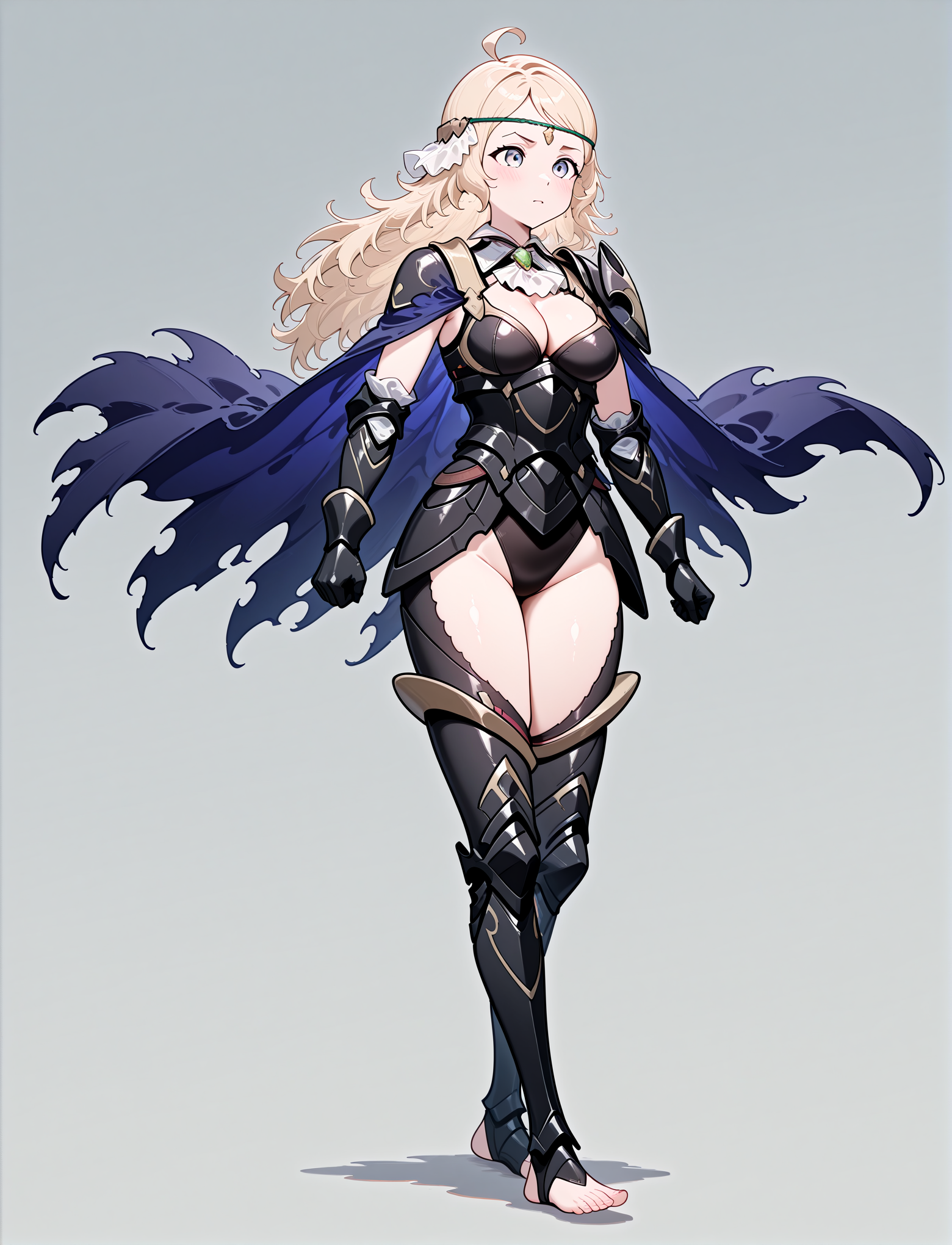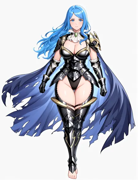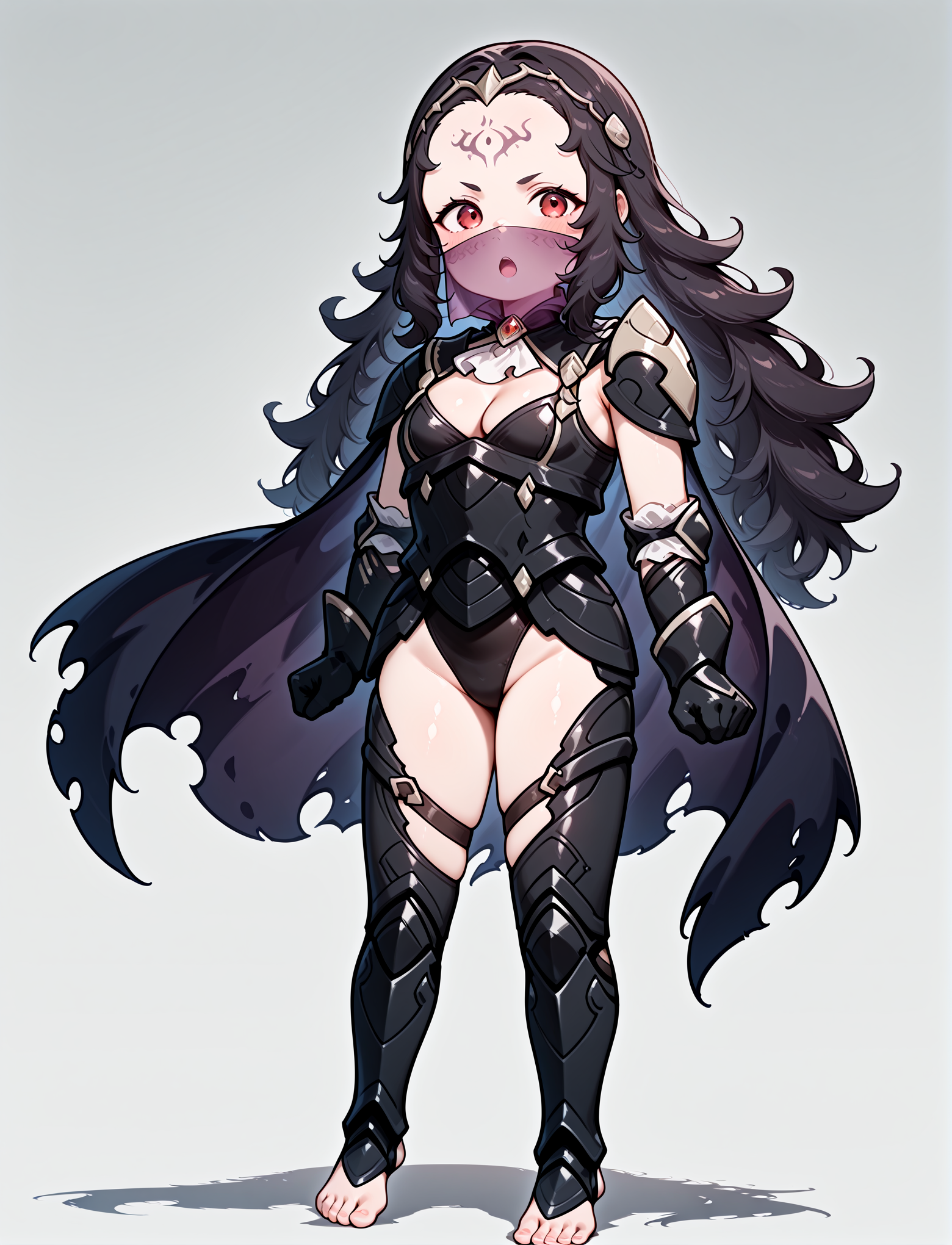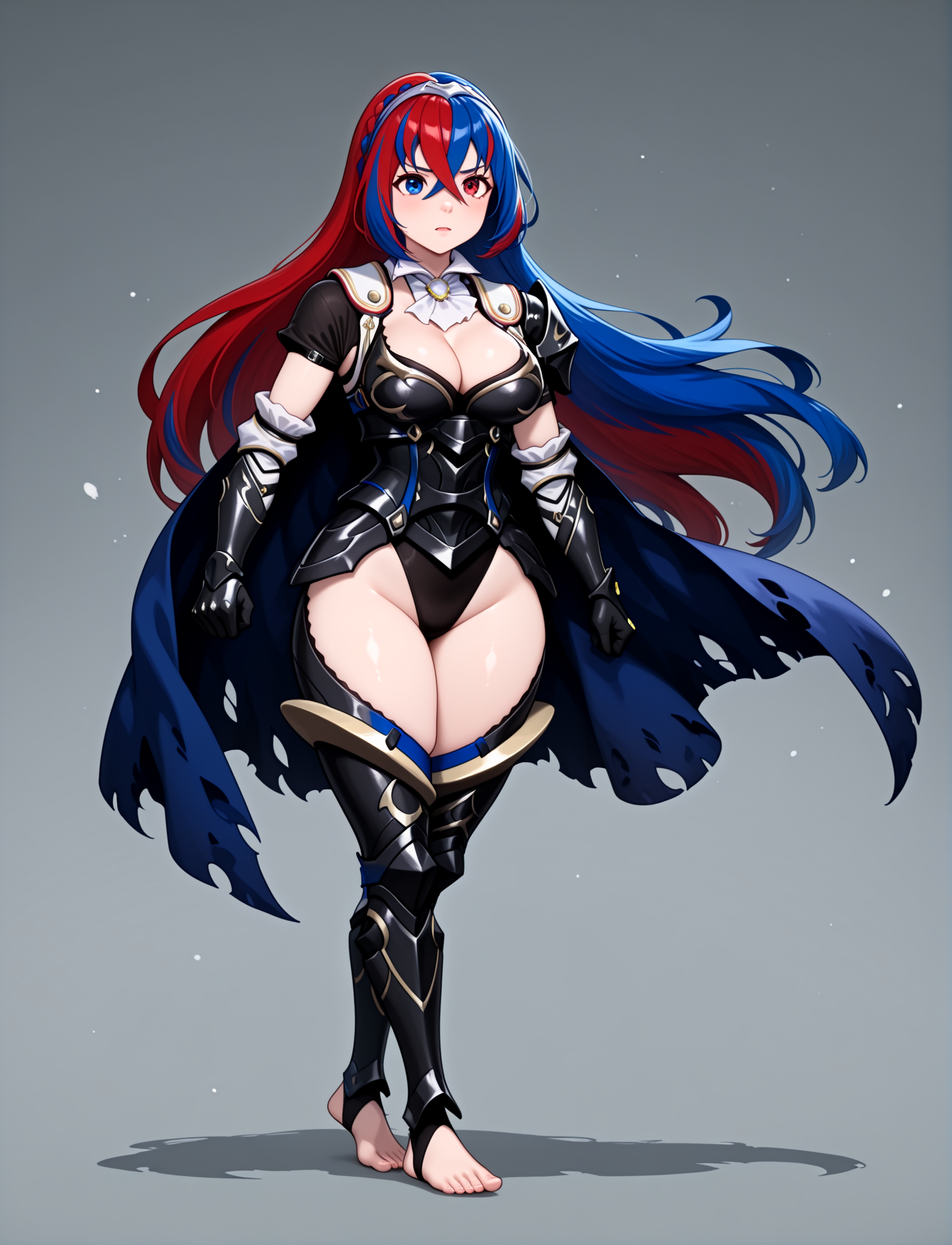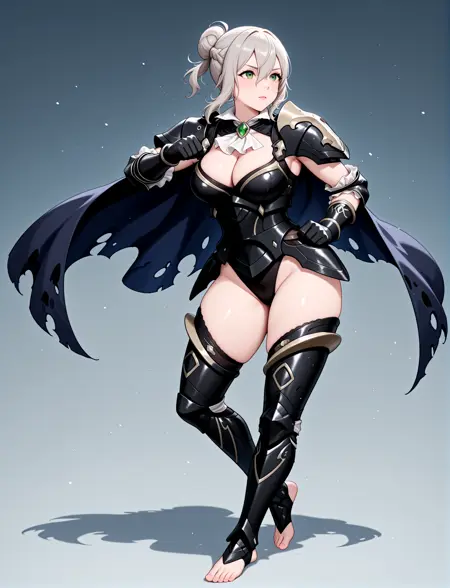 alternate costume, cleavage, black armor, shoulder armor, white ascot, black leotard, black gauntlets, black leotard, black greaves, thigh cutout, armored legs, toeless footwear, barefoot, torn cape
