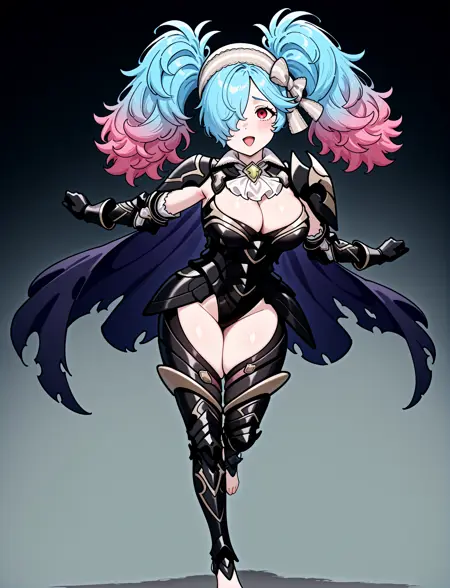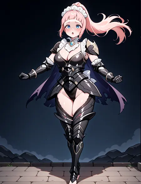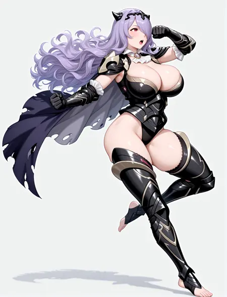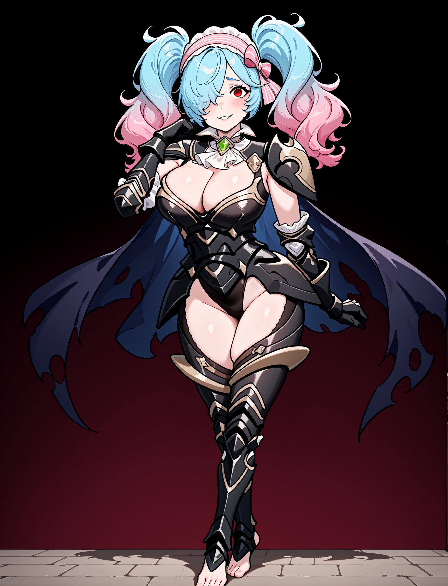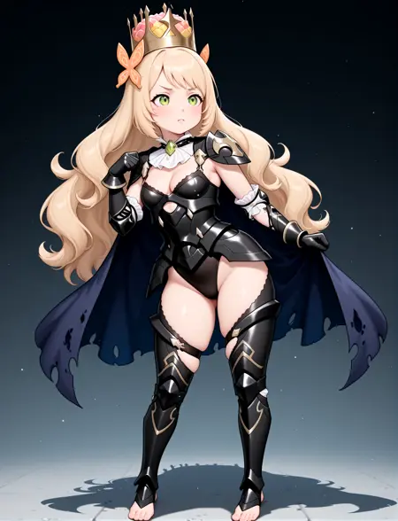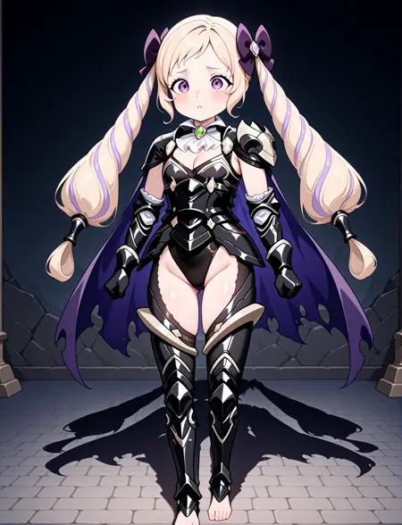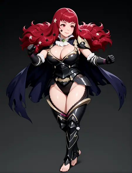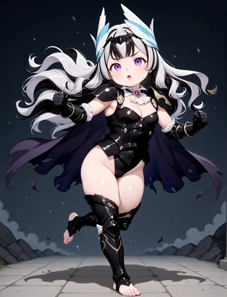 alternate costume, cleavage, black armor, shoulder armor, white ascot, black leotard, black gauntlets, black leotard, black greaves, thigh cutout, armored legs, toeless footwear, barefoot, torn cape