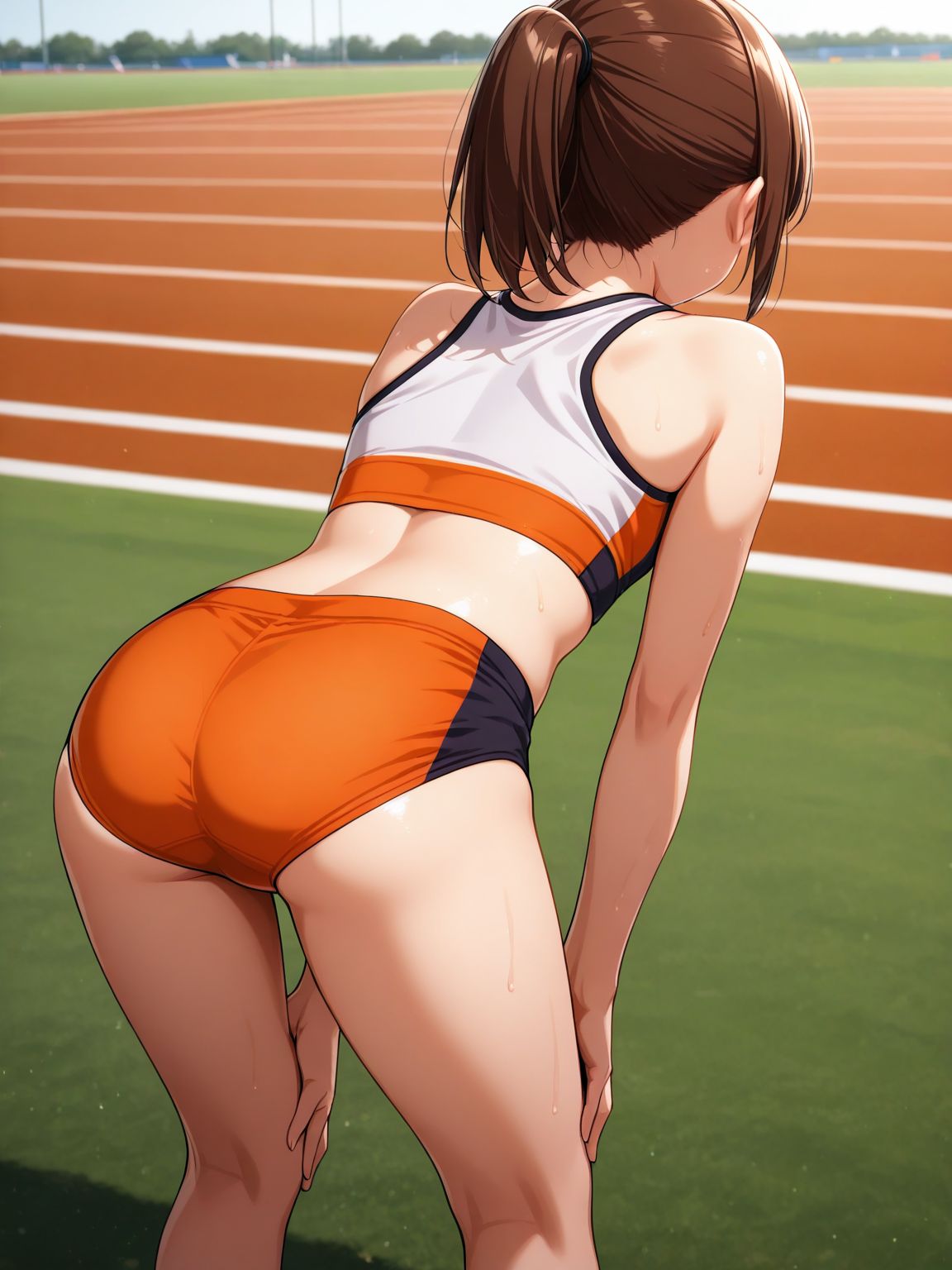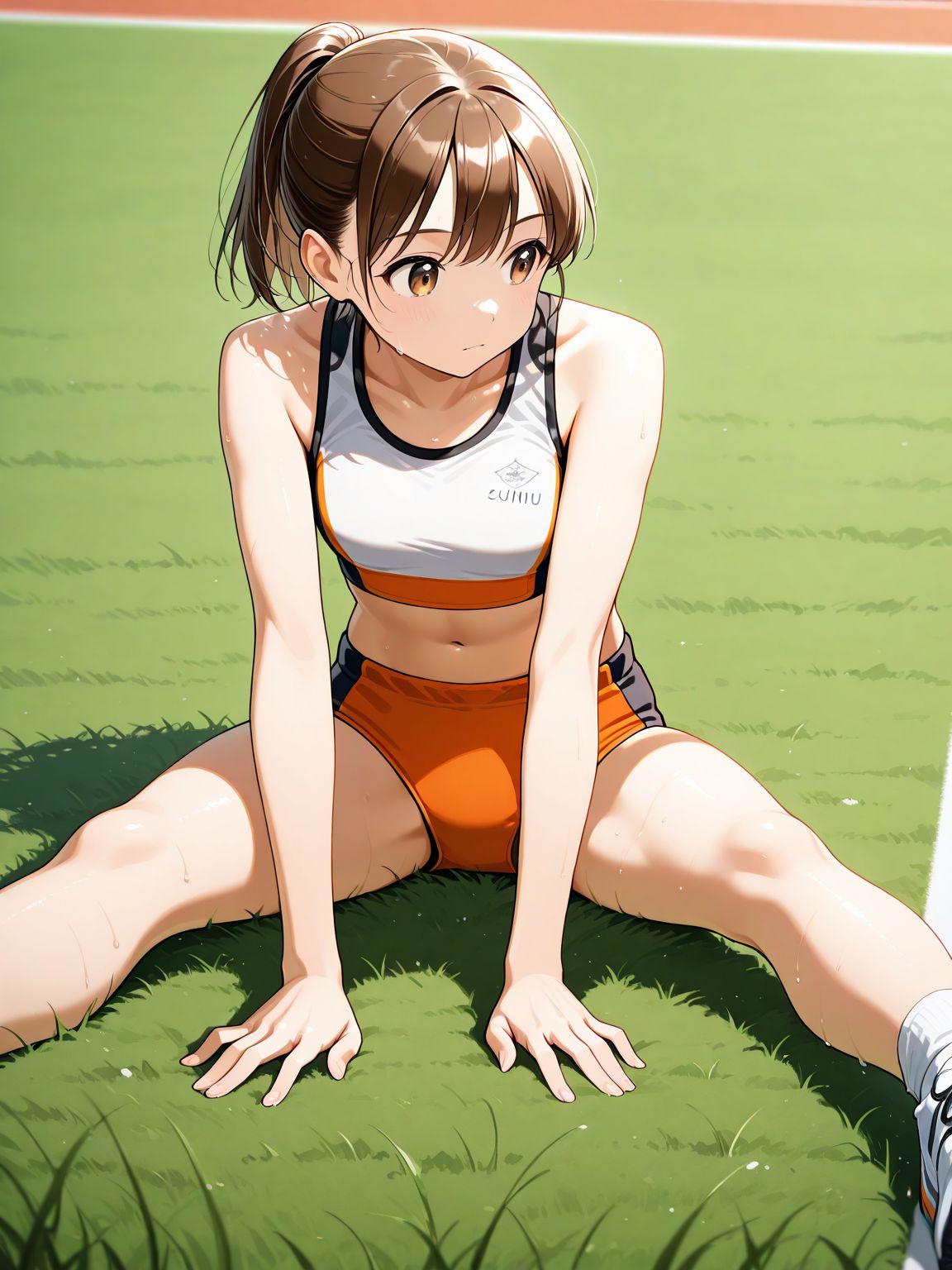 trackuni, 트랙 유니폼, buruma, 스포츠웨어, 스포츠 브라, 트랙 앤 필드, 스포츠 비키니, 주황색 반바지, 흰색 스포츠 브라, 드러난 어깨, 이톤 스포츠 브라, 크롭탑, 복부,