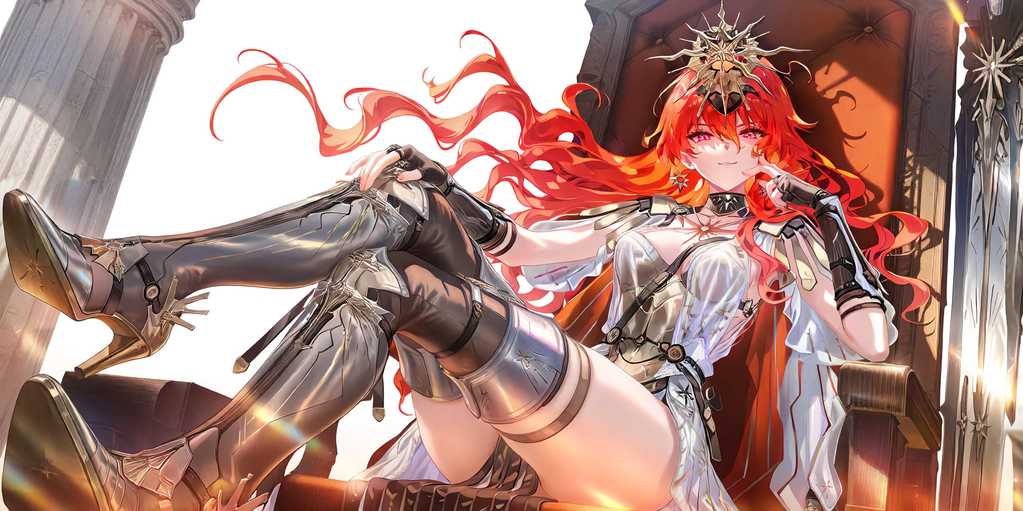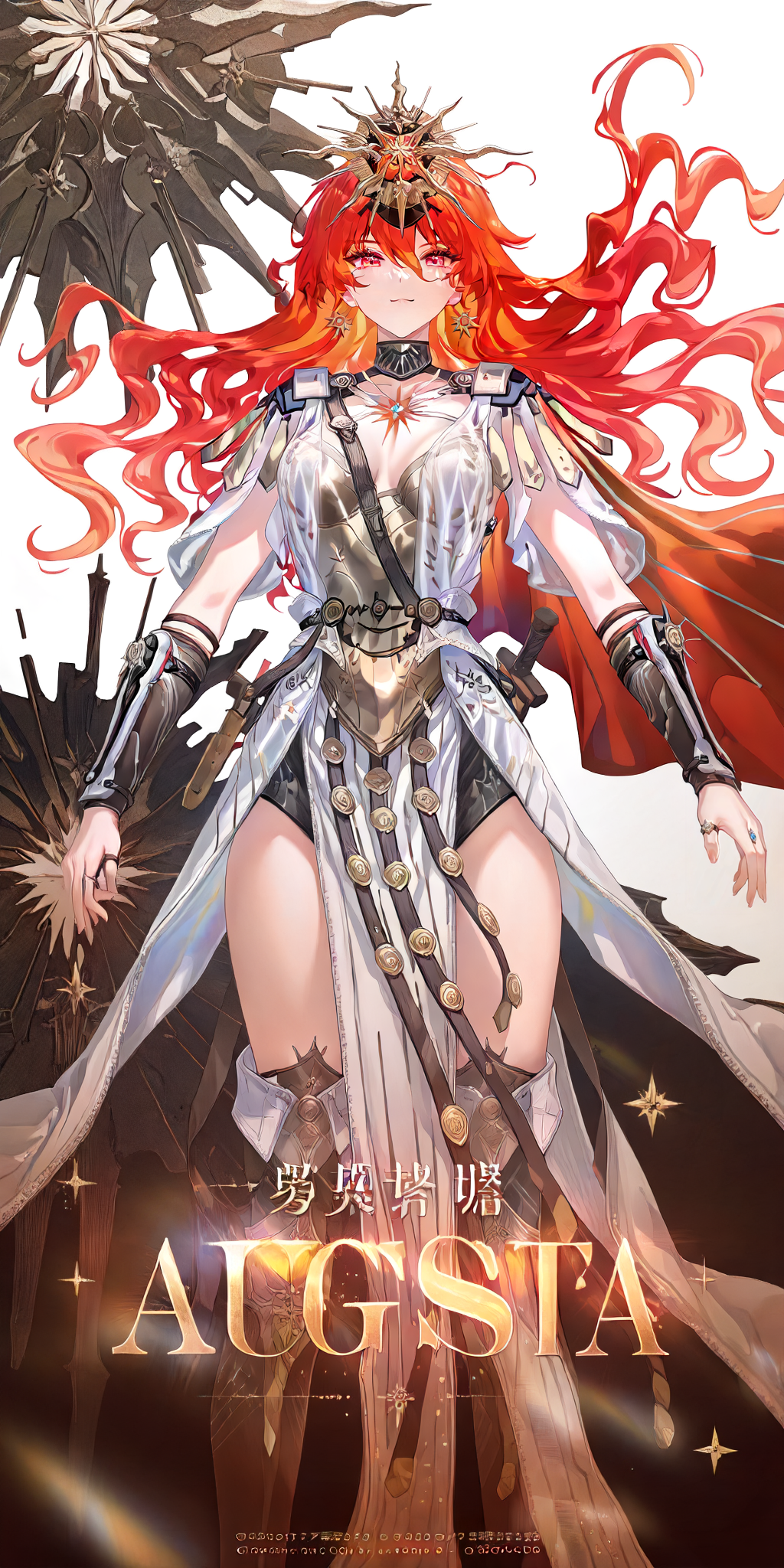 긍정적: Augusta\(wuthering waves\), 왕관, 솔로, 빨간 눈, 빨간 머리, 긴 머리, 눈 사이의 머리카락, Augusta 흰 드레스, 투명, 골반 커튼, 갑옷, 허벅지 부츠, 하이힐, (교체 가능: 다리 노출, 발 노출, 발목 족쇄), 보석, 귀걸이, 앞머리, 잠금뼈, 가슴, 빨간 망토, 반지, 검, 무기, 빨간 망토, 목조개, 시청자 바라보기, 입 닫음, 미소, 발 프레임 밖, 단순한 배경, 흰 배경, (교체 가능: 타로 배경)