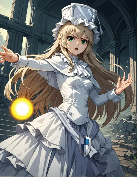 魔法服装: pmmmorikomikuni,长发,白色花边帽子,白色领结,灰色宝石吊坠,白色短斗篷,白色连衣裙,腕带,装饰性裙盾