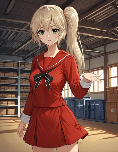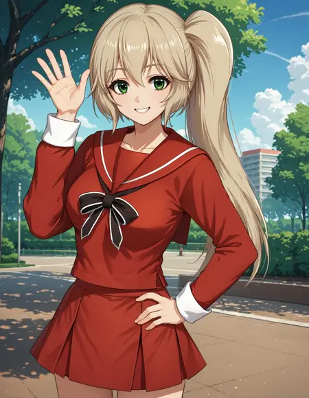 制服: pmmmorikomikuni,侧马尾,红色衬衫,红色水手领,红色裙子,黑色领结