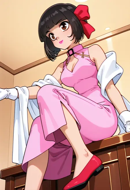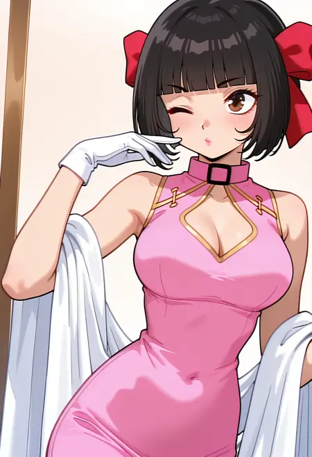 kazusa_china, black hair, short hair, bob cut, blunt bangs, brown eyes, lipstick, breasts,