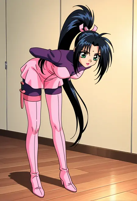 粉红色发带, 紫色紧身衣, 粉色裙子, 粉色拉链, 婚纱手套, 刀鞘, 粉色长靴