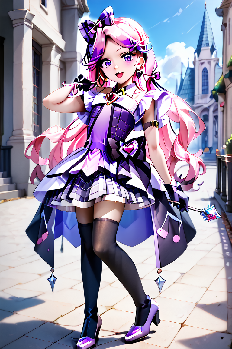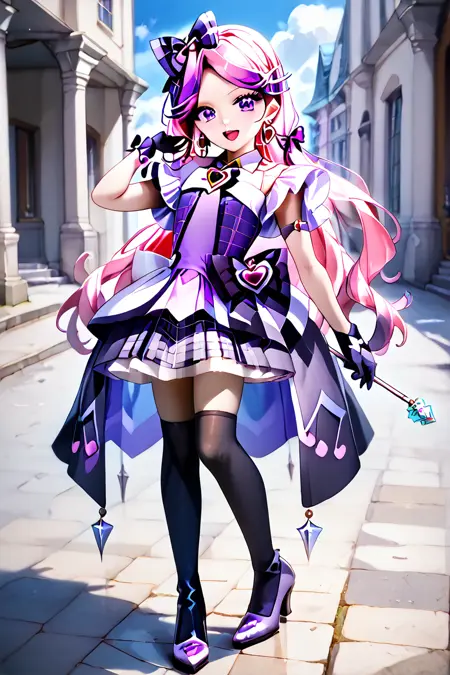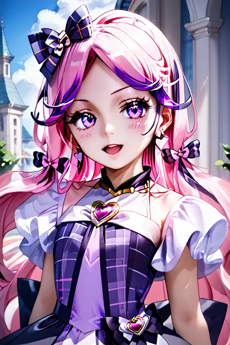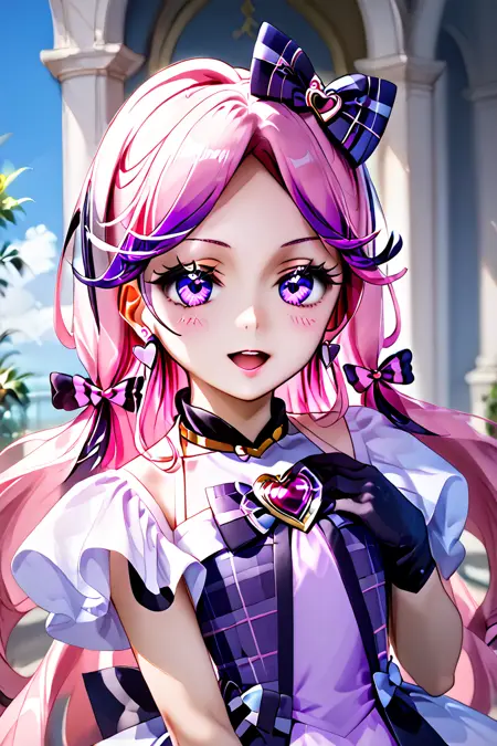 curekiss, 1girl, solo, 시청자 바라보기, 머리 장식, 리본, 보석, 매우 긴 머리, 보라색 눈, 분홍색 머리, 머리 리본, 보라색 머리, 다색 머리, 머리 리본, 귀걸이, 검은 장갑, 갈라진 앞머리, 검은 리본, 체크 무늬 치마, 보라색 드레스, 하트 귀걸이, 하트 브로치, 체크 무늬 리본, 드레스 리본, 체크 무늬 드레스, 스트라이프 머리, 검은 허벅지 스타킹, 미니 치마, 회색 치마, 보라색 신발, 젯타이료이키,