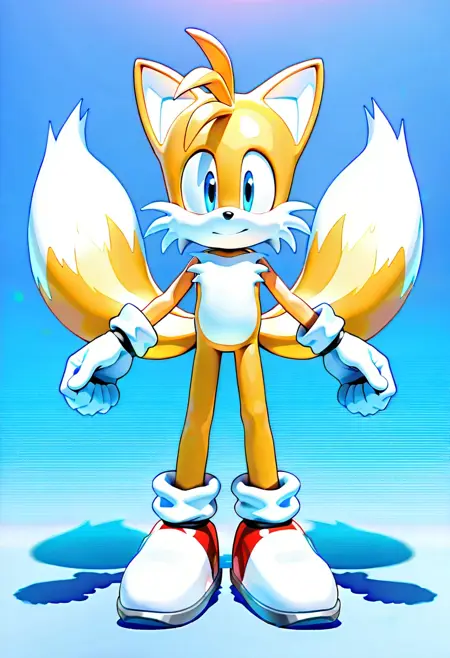 ModernTails, 1boy, yellow fox, large blue eyes, white gloves, red-and-white shoes, two tails, sonic the hedgehog, white chest,