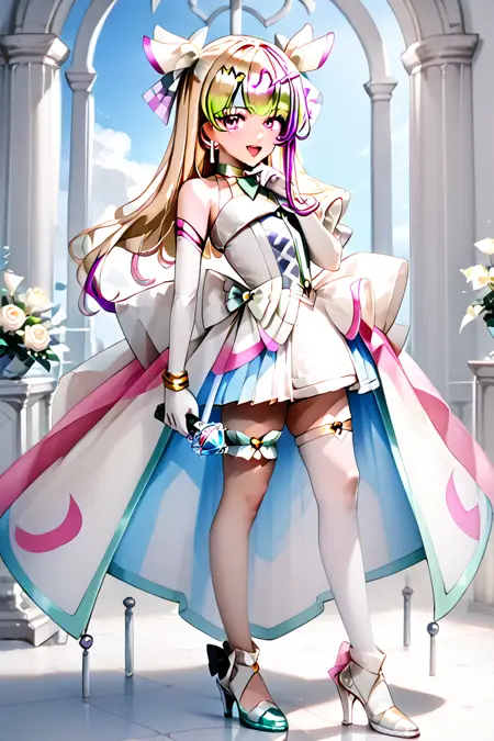 curezukkyun, 1girl, ソロ, 長い髪, 視聴者を見つめる, ブロンドの髪, 髪飾り, 手袋, ドレス, チャイナ足長靴, ボウタイ, ジュエリー, 肩を露出, ピンクの髪, 多色の髪, ピアス, 緑の髪, 肘まで手袋, 白い手袋, ピンクの目, 白いドレス, 白いチャイナ足長靴, ストライプ模様の髪, ヒール, 太ももストラップ, 白い靴, 白いボウタイ, 片方のチャイナ足長靴, 髪のボウタイ,