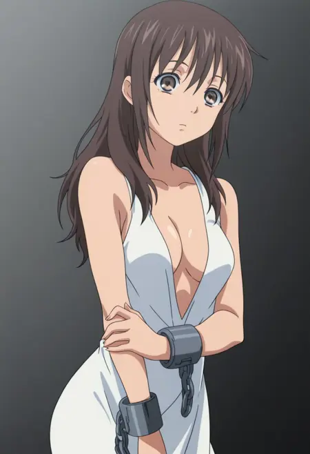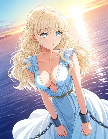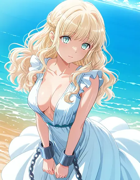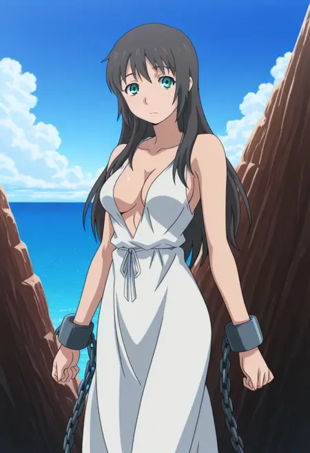 princess_andromeda_(dress), white dress, sleeveless, plunging neckline, collarbone, shackles, cuff bracers, chains on wrists