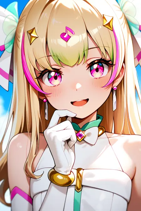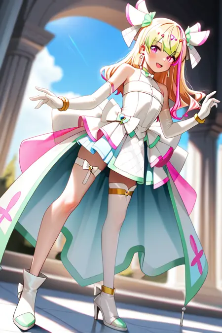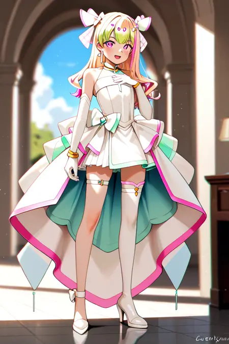 curezukkyun, 1个女孩, 单人, 长发, 看着观众, 金色头发, 发饰, 手套, 连衣裙, 过膝袜, 蝴蝶结, 珠宝, 裸露肩膀, 粉色头发, 多色头发, 耳环, 绿色头发, 肘部手套, 白色手套, 粉色眼睛, 白色连衣裙, 白色过膝袜, 染发, 高跟鞋, 大腿绑带, 白色鞋履, 白色蝴蝶结, 单侧过膝袜, 发带