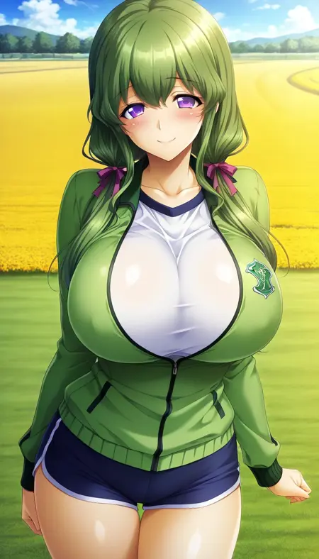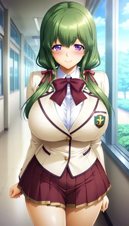 니토 도모에, 녹색 머리카락, 더블 테일, 보라색 눈