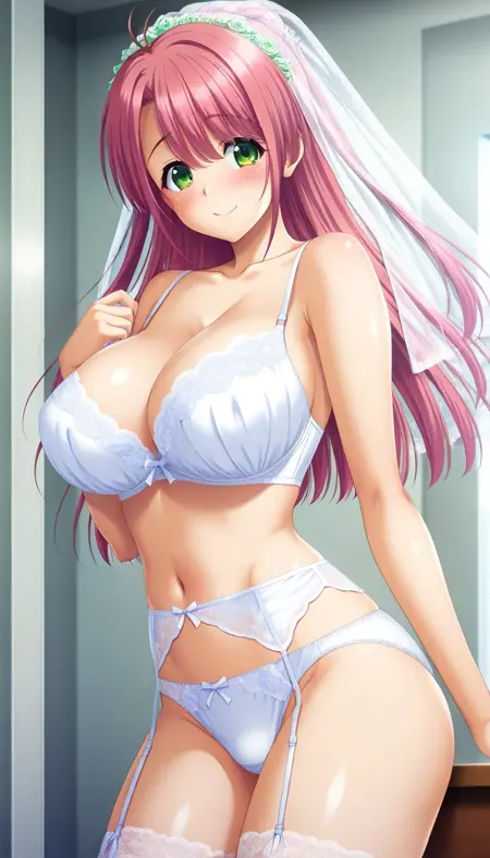 크라사와 아야나, 분홍색 머리카락, 옆으로 갈라짐, 녹색 눈