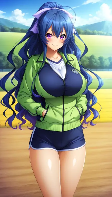 토우죠 마히로, 파란색 머리카락, 긴 머리카락, 물결모양, 포니테일, 보라색 눈
