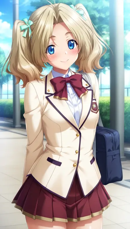타카자키 아이카, 금발 머리카락, 더블 테일, 파란 눈