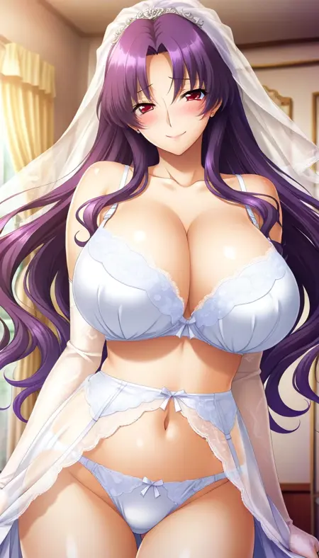 마ツ우라 안주, 자주색 머리카락, 긴 머리카락, 물결모양, 붉은 눈