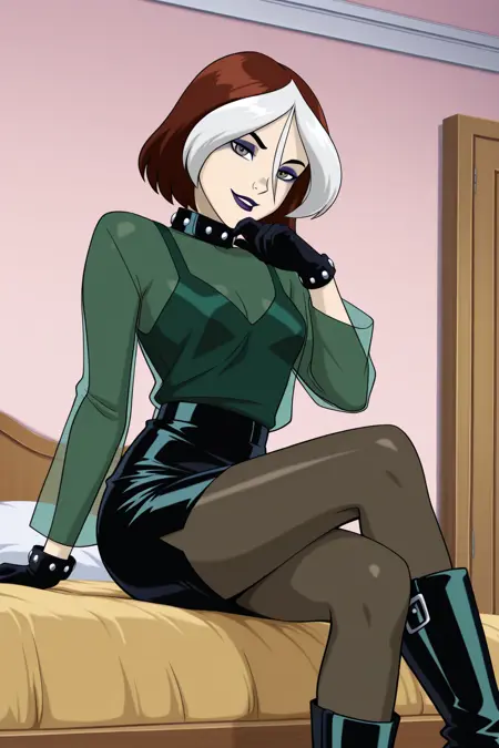 カジュアル衣装:スタッド付きカラー、透け感、グリーンのシャツ、長袖、黒い手袋、鉛筆スカート、タイツ、ブーツ
