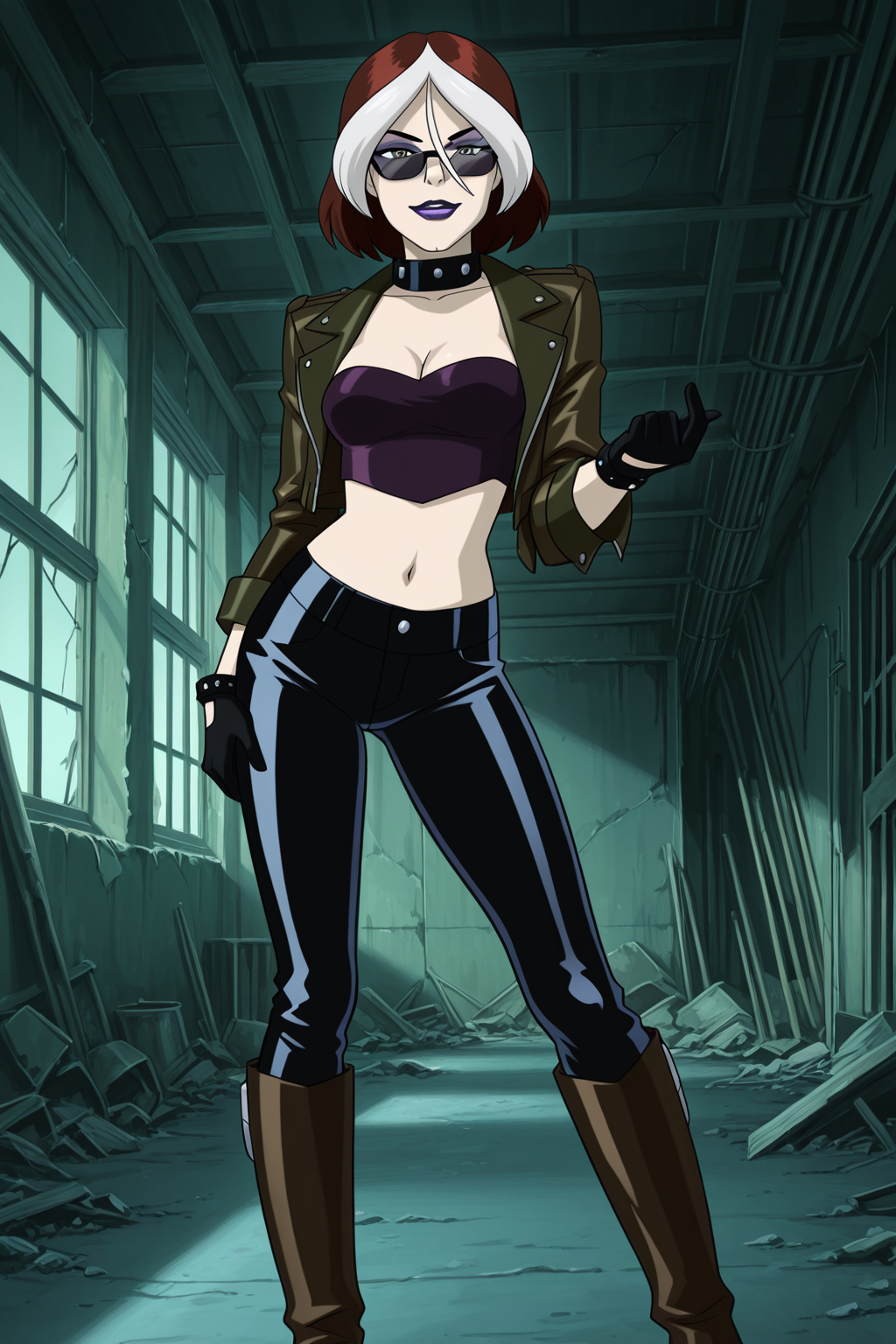 ベイビルのセイレーン:カラー、レザージャケット、短めのジャケット、レザー、胸元露出、チューブトップ、腹部露出、手袋、レザーパンツ、ぴったりしたパンツ、膝上ブーツ