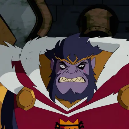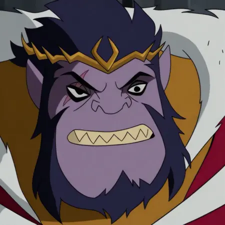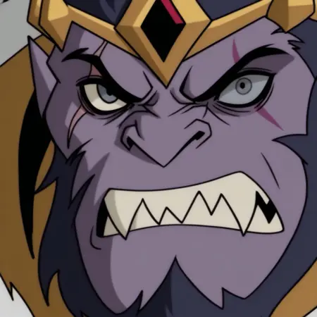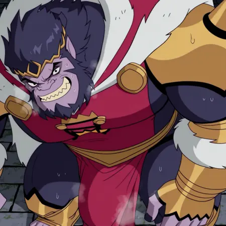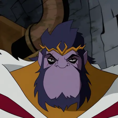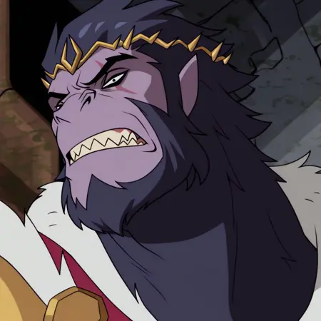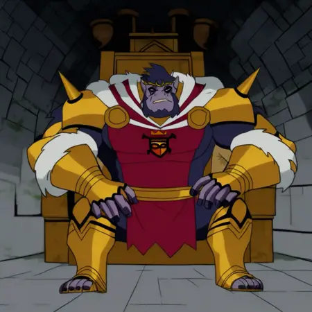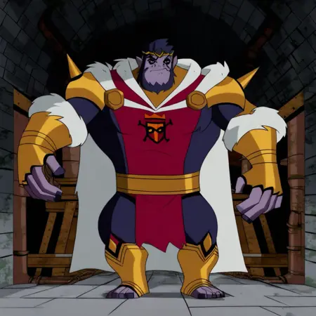 | 训练词汇 | Chadwick, furry male, facial hair, cape, shoulder armor, black hair, crown, black eyes, scar across right eye, blind in right eye, purple skin, pauldrons, pointy ears, fur trim, muscular, gold fingerless gauntlets, greyish black-furred, golden spikes on each shoulder, five huge fingers, golden boots, tattered robe on chest and around waist, gold boots with toes exposed, fur trim around gauntlets, 已复制! |