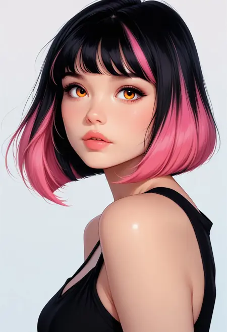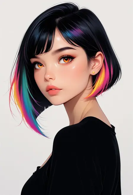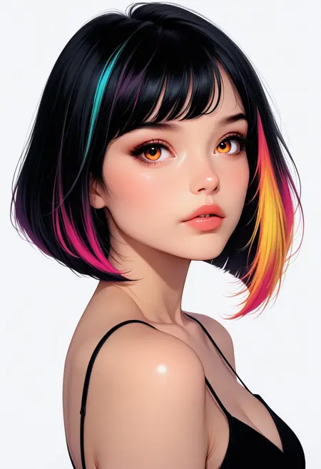 (Yuki、(カラフルなハイライトが入り、ボブカットの乱れた髪)、(完璧で自然な唇、ツヤのある唇)、琥珀色の目)