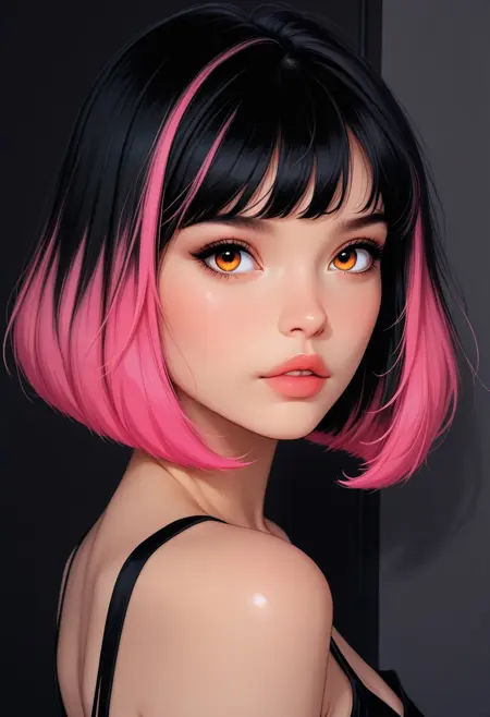 (Yuki , (shaggy bob cut hair with colorful highlights), (Perfect and natural lips, glossy lips), amber eyes))