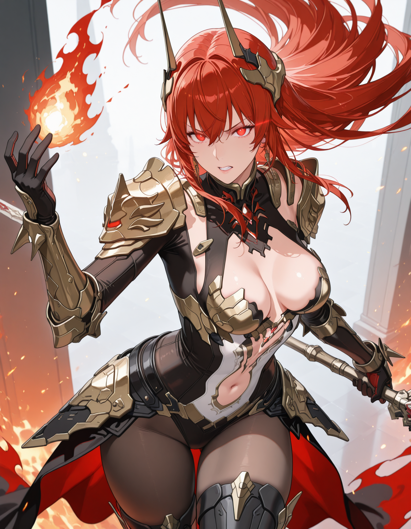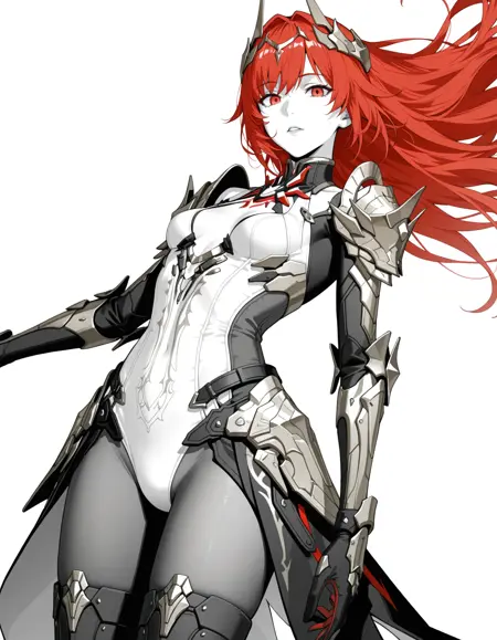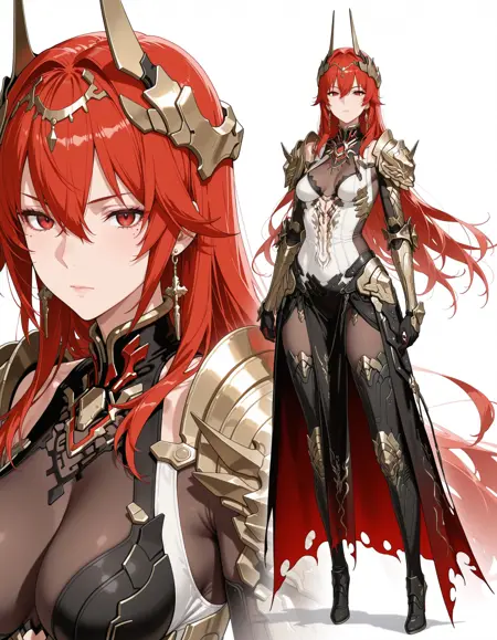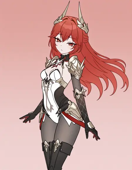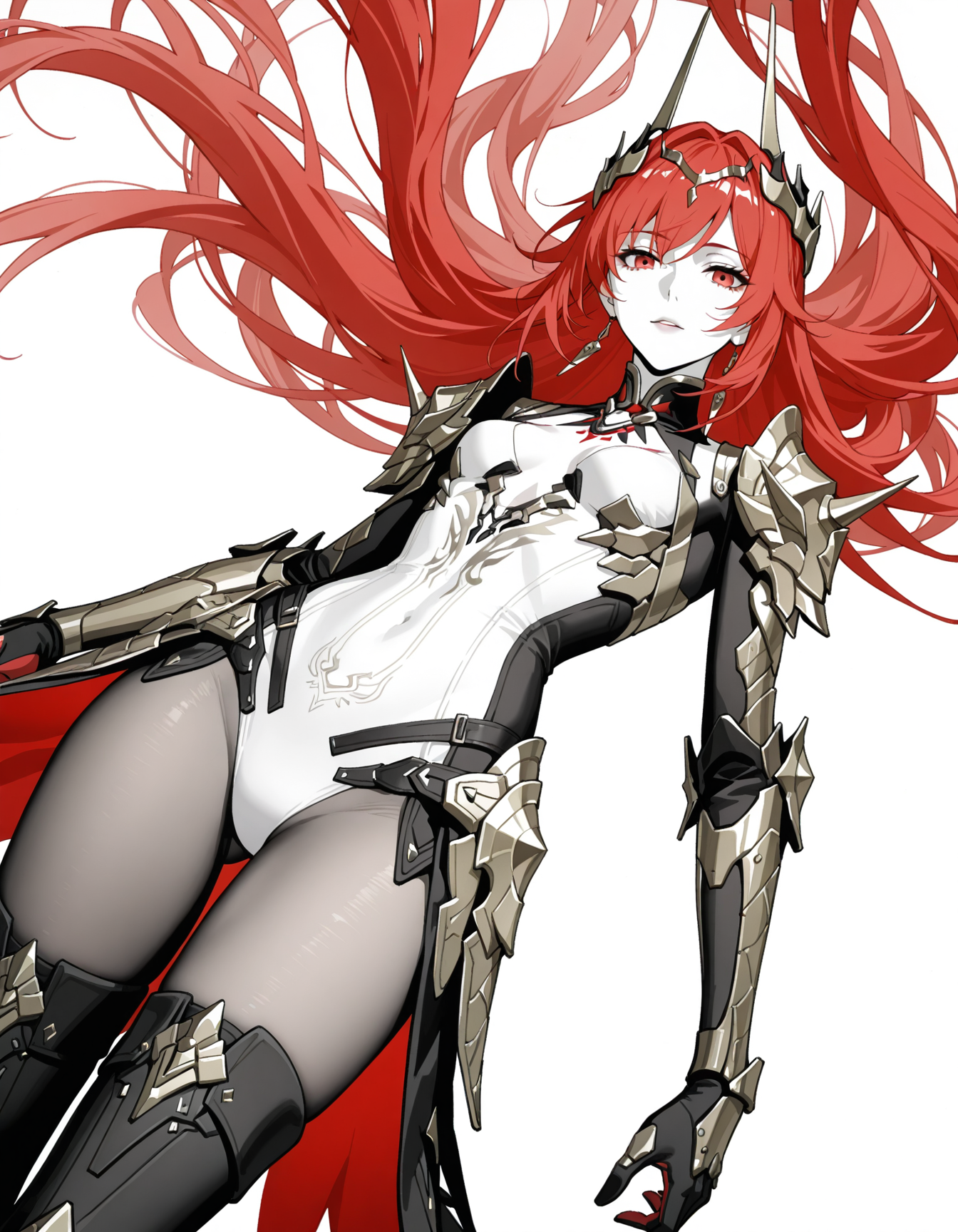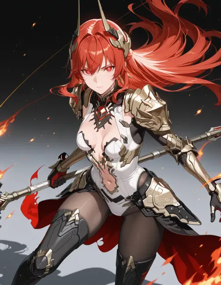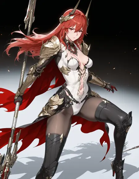 1girl,mai_pgr_vera_zw,mature female,(age up:2),(small_ breasts:2),solo,long_hair,breasts,looking_at_viewer,hair_ornament,gloves,red_eyes,thighhighs,holding,navel,hair_between_eyes,closed_mouth,cleavage,weapon,pantyhose,red_hair,boots,horns,black_footwear,holding_weapon,armor,leotard,high_heels,bodysuit,shadow,thigh_boots,headgear,shoulder_armor,polearm,gauntlets,high_heel_boots,pauldrons,spear,white_leotard,holding_polearm,waist_cape