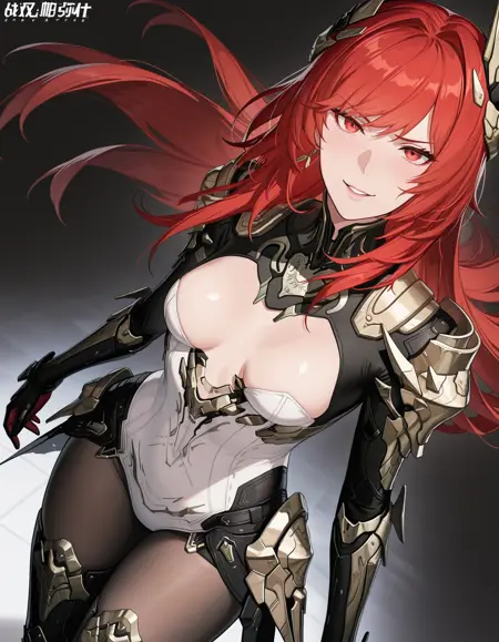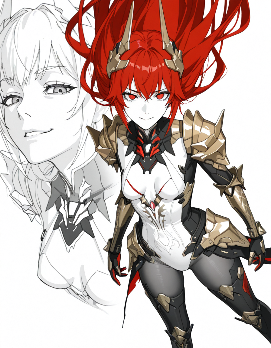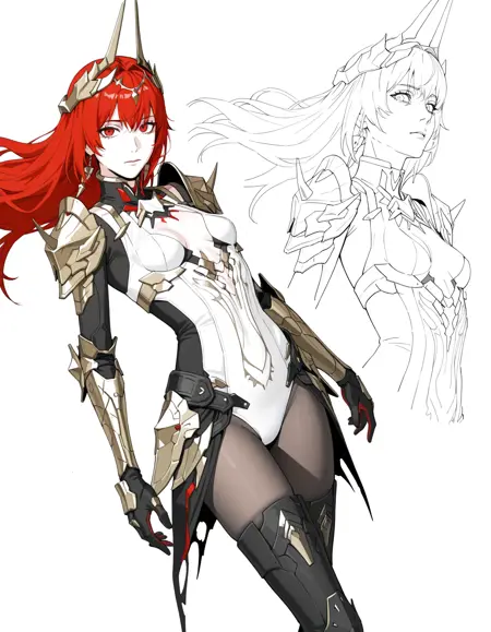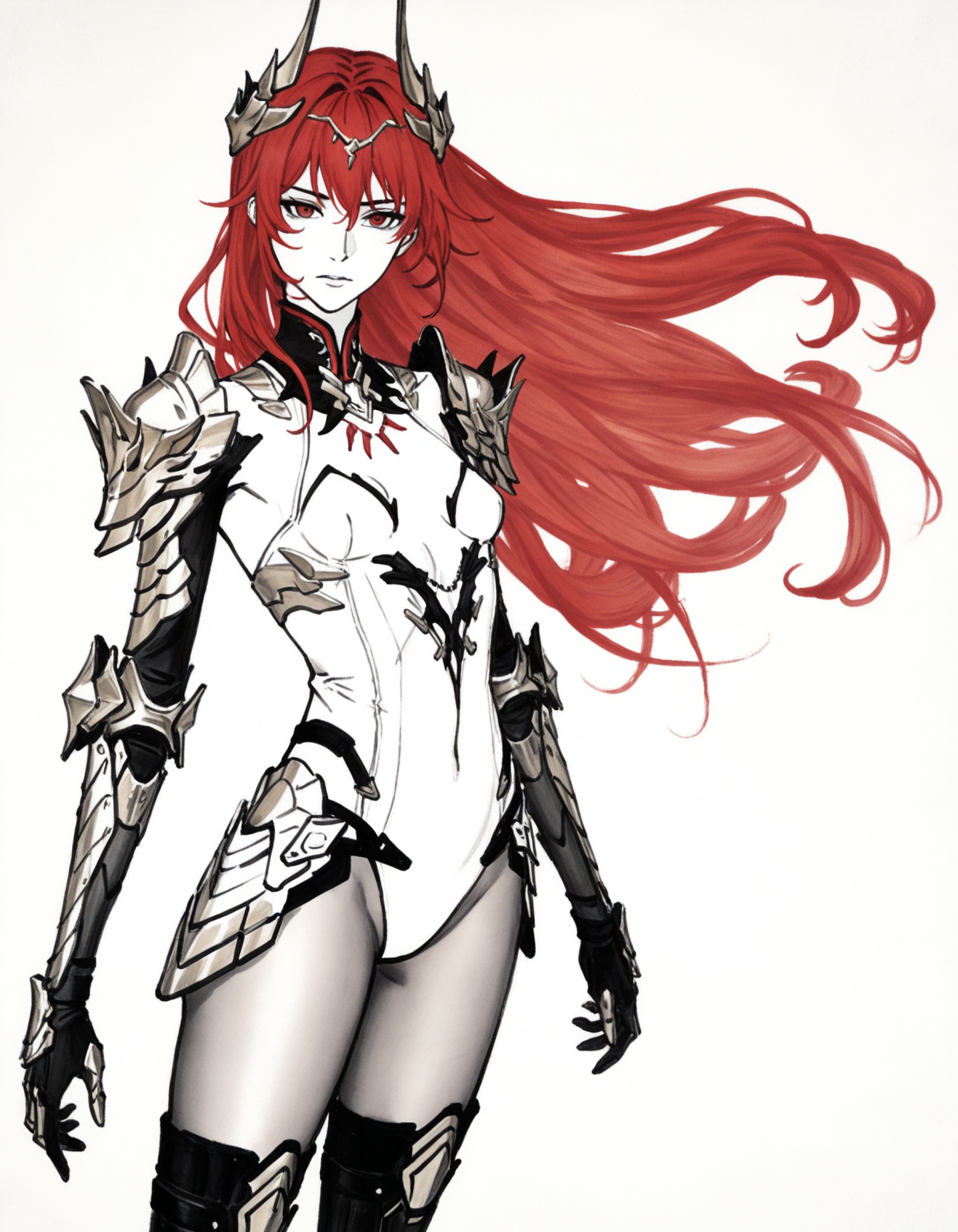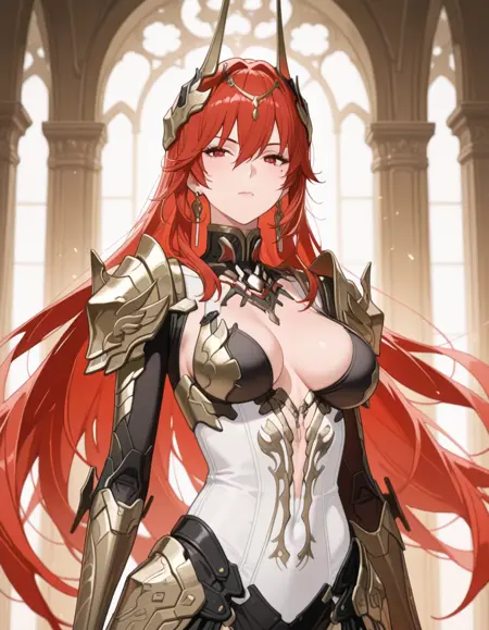 1girl,mai_pgr_vera_zw,mature female,(age up:2),(small_ breasts:2),solo,long_hair,breasts,looking_at_viewer,hair_ornament,gloves,red_eyes,thighhighs,holding,navel,hair_between_eyes,closed_mouth,cleavage,weapon,pantyhose,red_hair,boots,horns,black_footwear,holding_weapon,armor,leotard,high_heels,bodysuit,shadow,thigh_boots,headgear,shoulder_armor,polearm,gauntlets,high_heel_boots,pauldrons,spear,white_leotard,holding_polearm,waist_cape