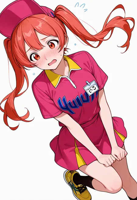 kokoro_s1, uniform_cnr, employee uniform, sportswear,pink shirt,skirt,hat, black socks, yellow sneakers, yellow footwear,