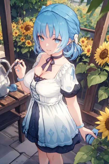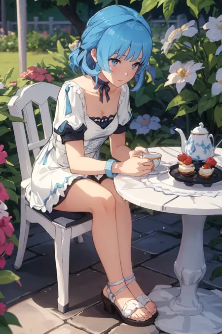 shiny blue hair, shiny blue eyes, blue nails, nail polish, toenails, toenail polish, bow, ribbon, jewelry, collarbone, choker, medium hair, puffy white sleeves, short sleeves, white dress, french braid, bracelet, hair intakes, medium breasts, strappy heels, sandals, toeless footwear, split skirt, blue skirt,