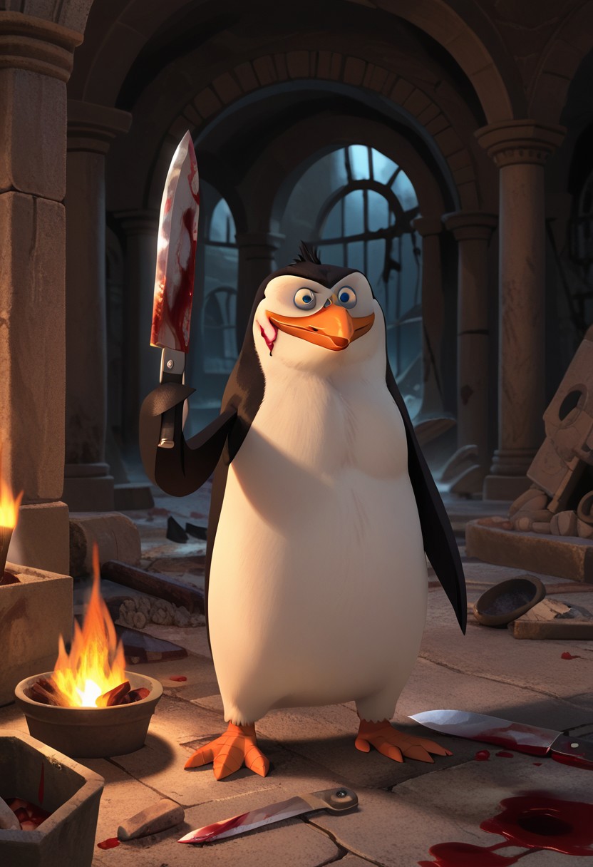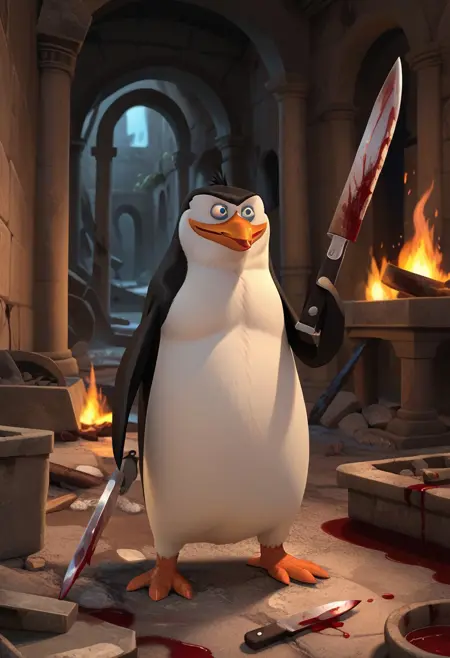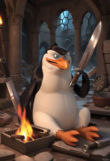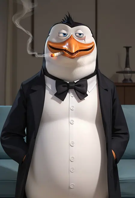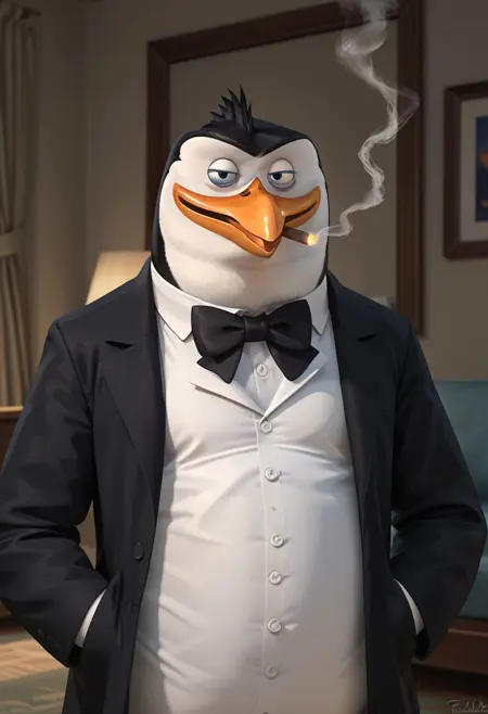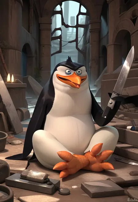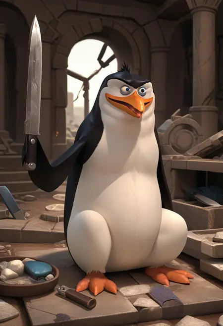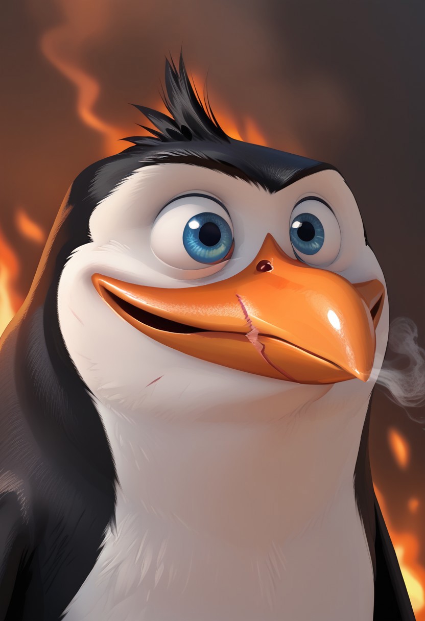 1boy, male, animal, furry, feral, penguin, bird, black and white feathers, yellow beak, 3 toes, blue eyes, flippers, scar