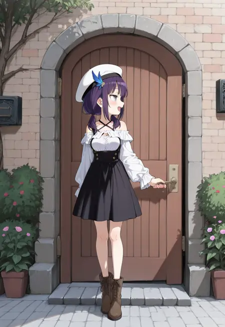 (girl at the entrance:1.2),standing ,full body, opening the door,hand on door,