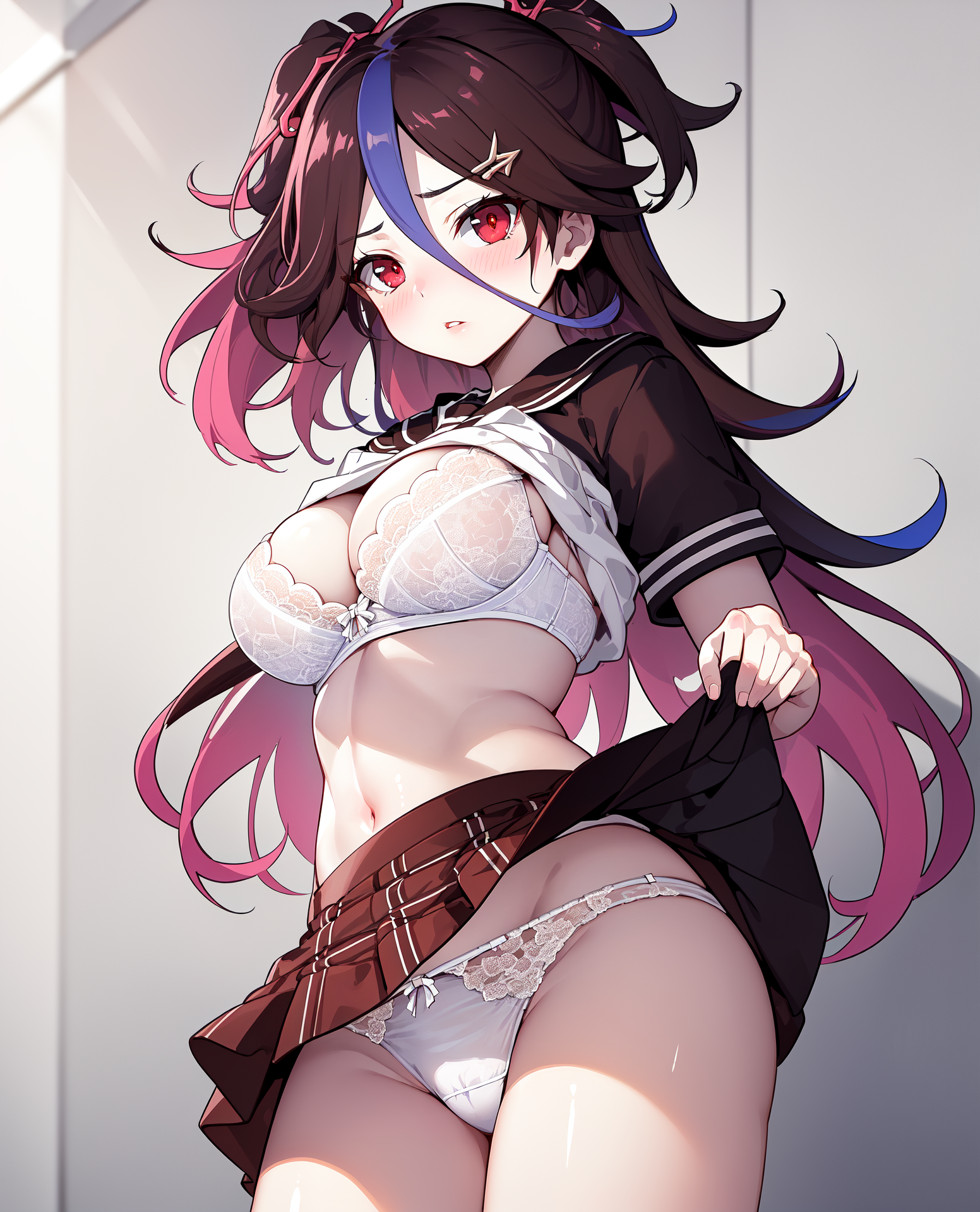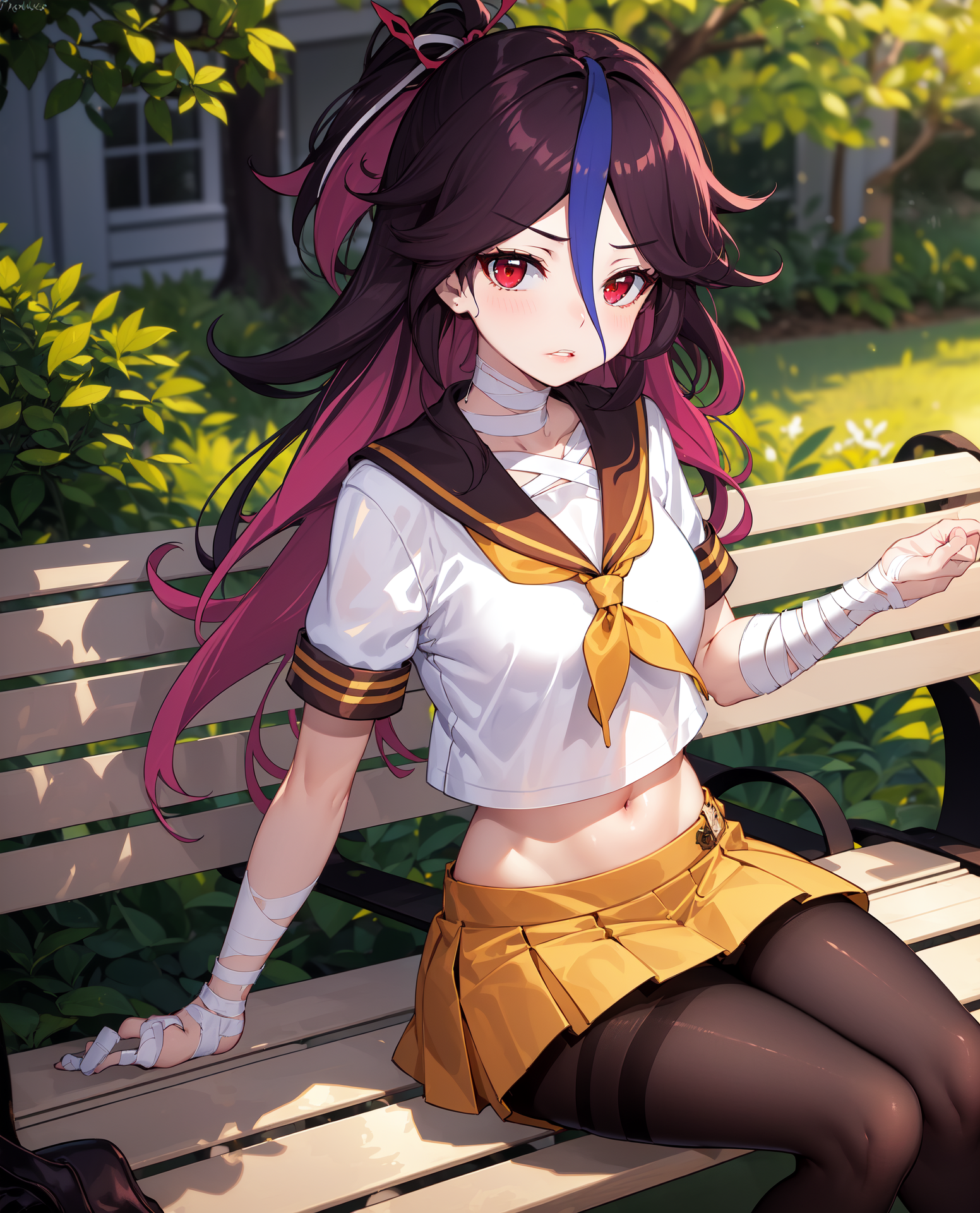 Some additional tags for default outfit: serafuku, purple hair, two tone hair, pantyhose, midriff, bandages.
