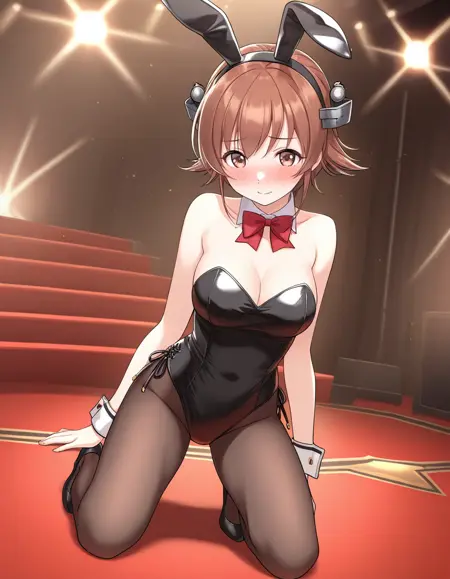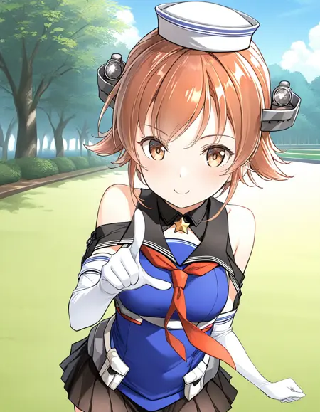 ノーマル:richardplunikc、茶色の髪、フリップヘア、茶色の目、頭部装具、白い帽子、白いシャツ、肩出し、肩の切り欠き、黒い海軍領、赤いネッカチーフ、肘まで手袋、白い手袋、黒いスカート、プリーツスカート、ミニスカート、グレーのブーツ、太ももまでブーツ