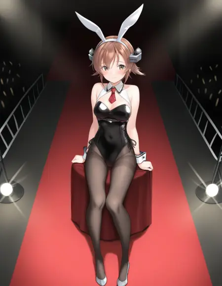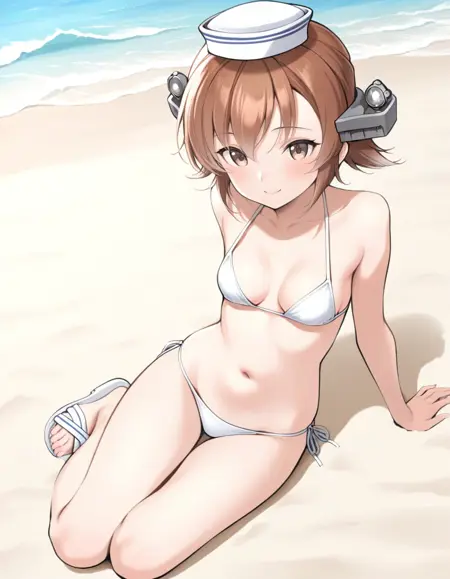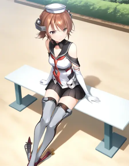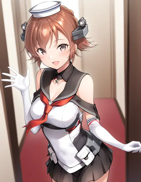 Normal : richardplunikc, brown hair, flipped hair, brown eyes, headgear, white hat, white shirt, bare shoulders, shoulder cutout, black sailor collar, red neckerchief, elbow gloves, white gloves, black skirt, pleated skirt, miniskirt, grey boots, thigh boots