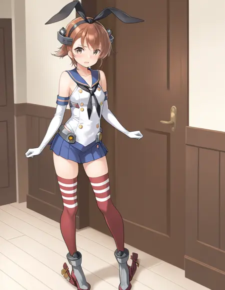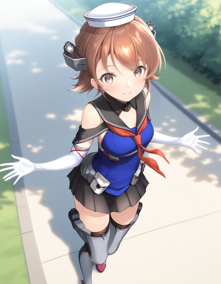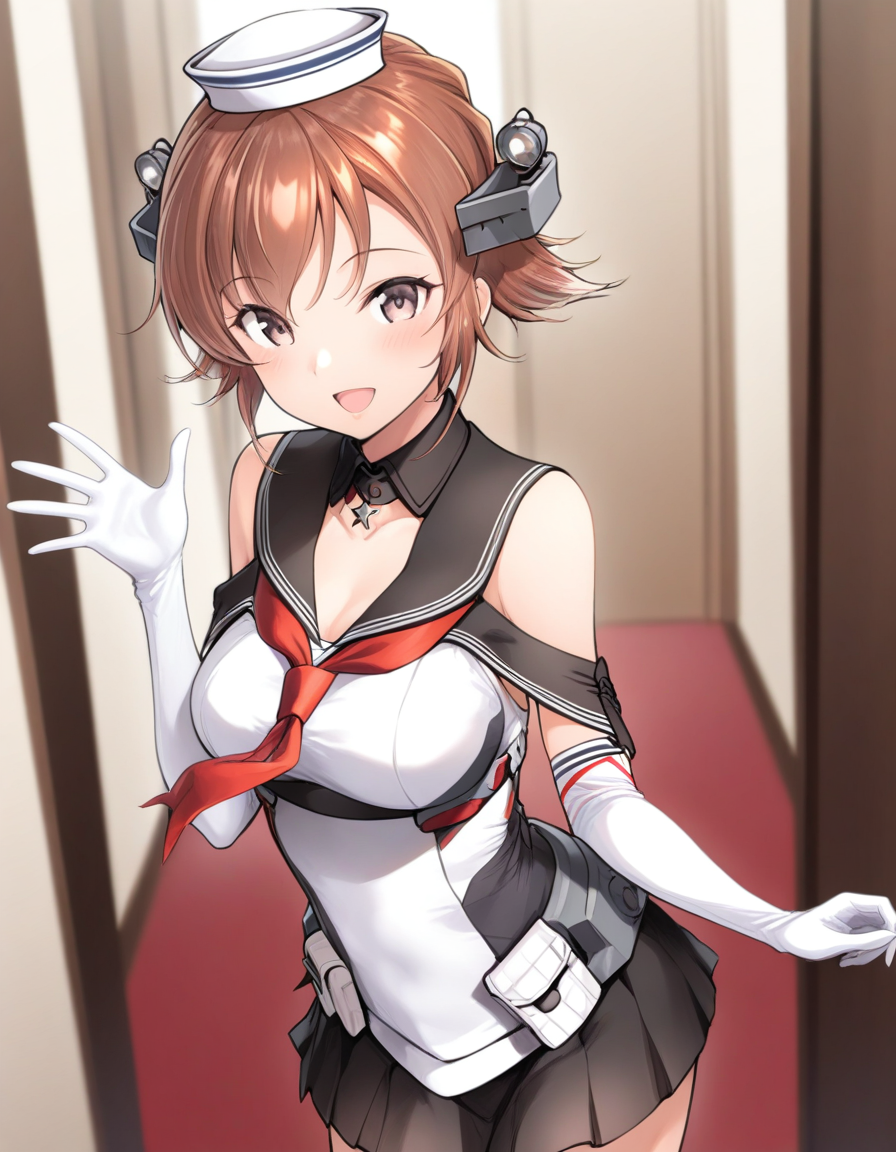 Remodel : richardplrekc, brown hair, flipped hair, brown eyes, headgear, white hat, blue shirt, bare shoulders, shoulder cutout, black sailor collar, red neckerchief, elbow gloves, white gloves, black skirt, star \(symbol\), pleated skirt, miniskirt, grey boots, thigh boots