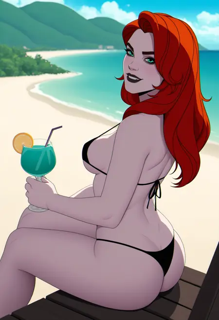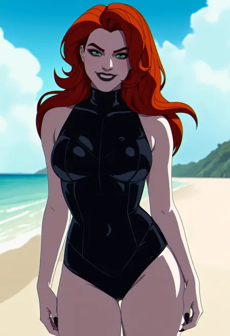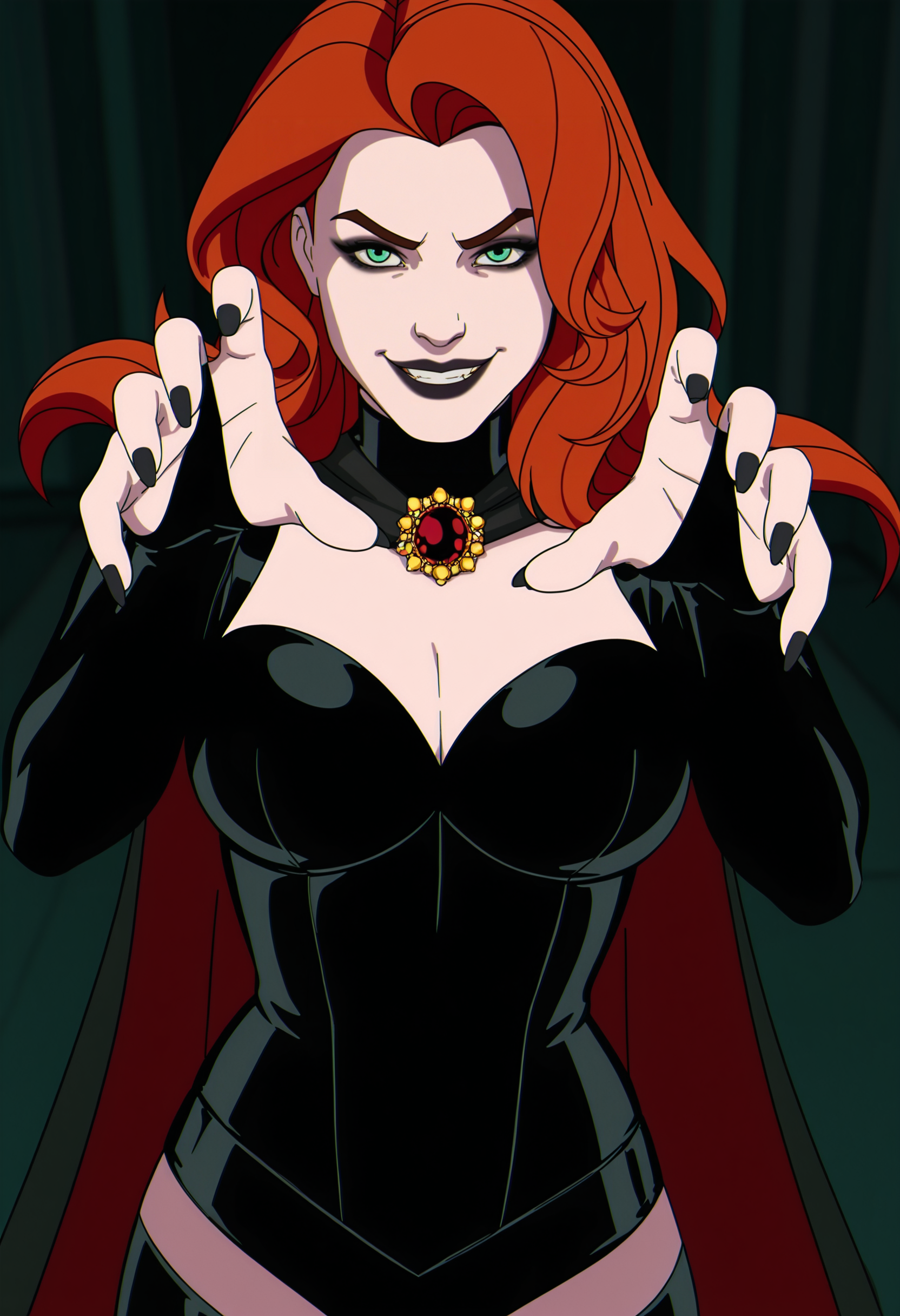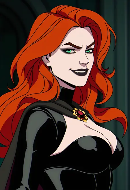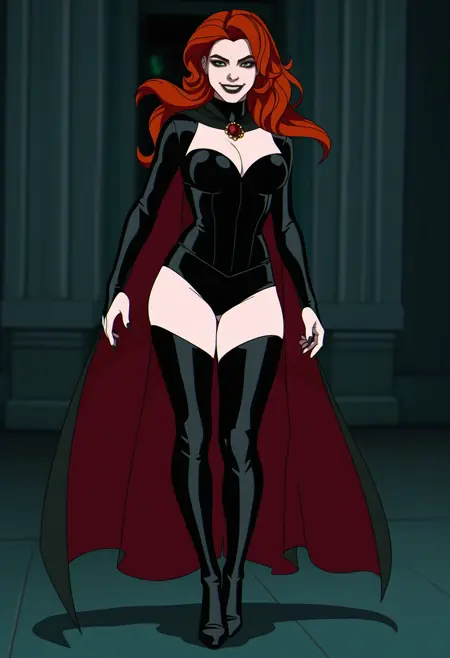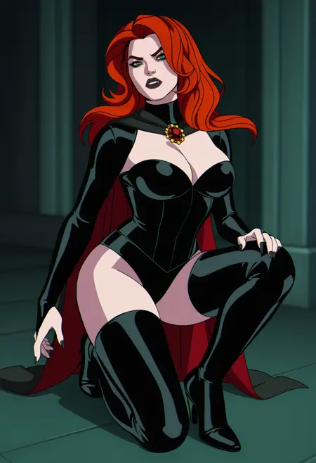 g0jilf, 1girl, red hair, long hair, green eyes, breasts, cleavage cutout, cape, collar jewel, leotard, bridal gauntlets, black lips, thigh boots