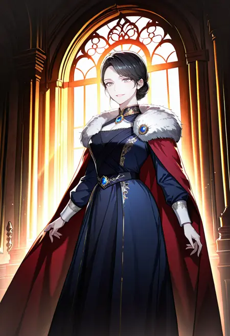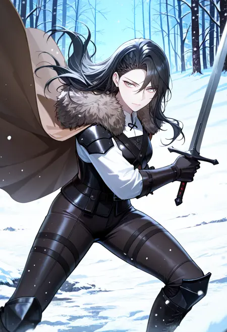 white shirt, black leather armor, harness, tight pants, brown cloak, fur trim, black gloves, knee boots