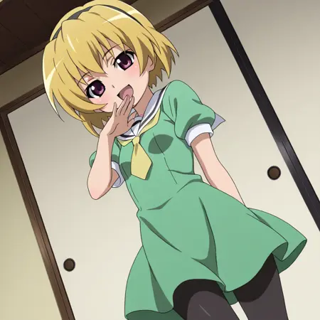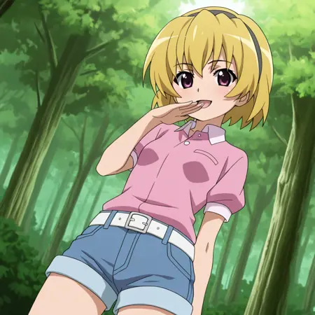 Houjou Satoko (higurashi no naku koro ni),blonde hair,short hair,purple eyes,small breast,black hairband