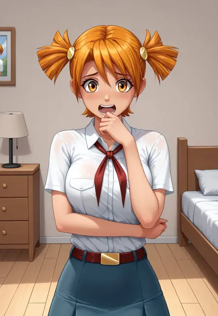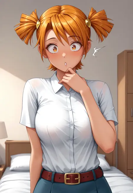 AliceES, orange hair, round golden hair ornament, orange eyes, short twintails
