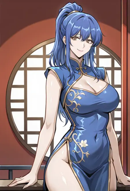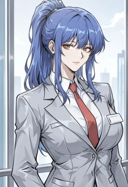 wanlinfa, blue hair, ponytail, brown eyes, large breasts, grey suit, red necktie,